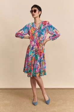 This vibrant botanical print dress features a flowing silhouette that flatters every figure, perfectly capturing the spirit of summer. Made from a lightweight, comfortable fabric, it combines ease, femininity, and effortless care.