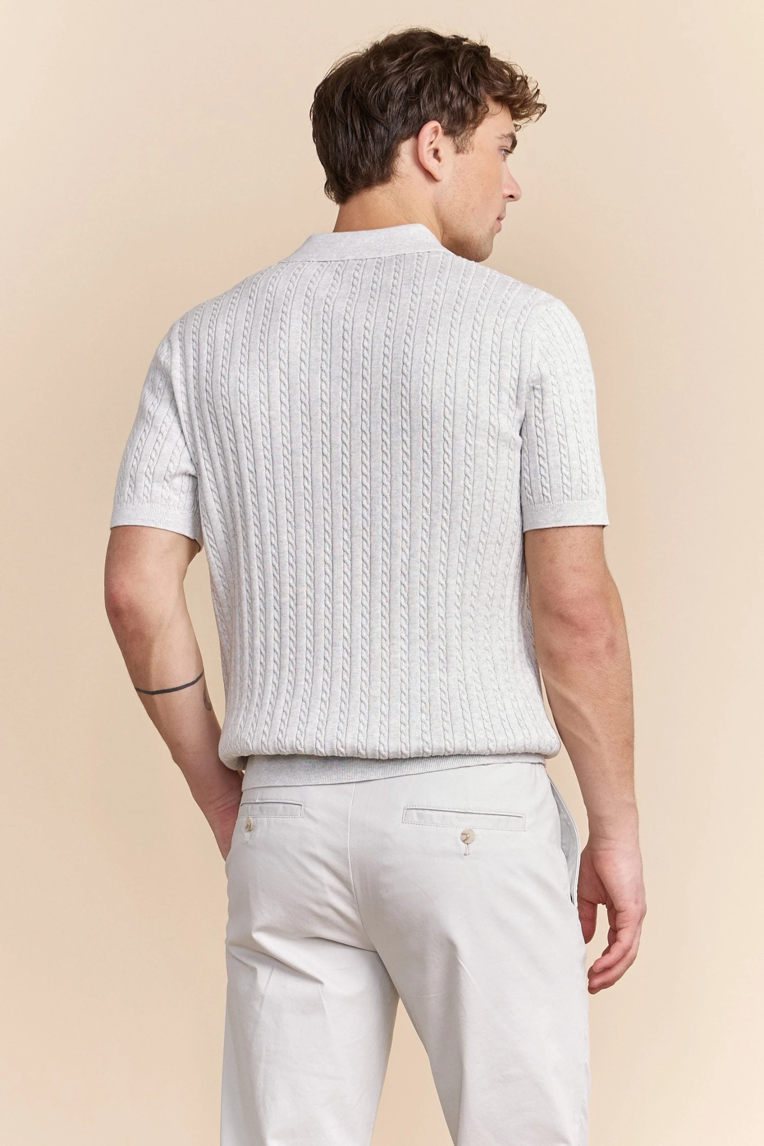 Discover polished style with our cable knit polo! This classic piece not only enhances your wardrobe but provides the comfort of soft, breathable cotton. Ideal for the modern gentleman seeking a refined yet relaxed fit, pair it with your favorite trousers for a laid-back, yet sophisticated look. Indulge in craftsmanship where simplicity meets elegance.