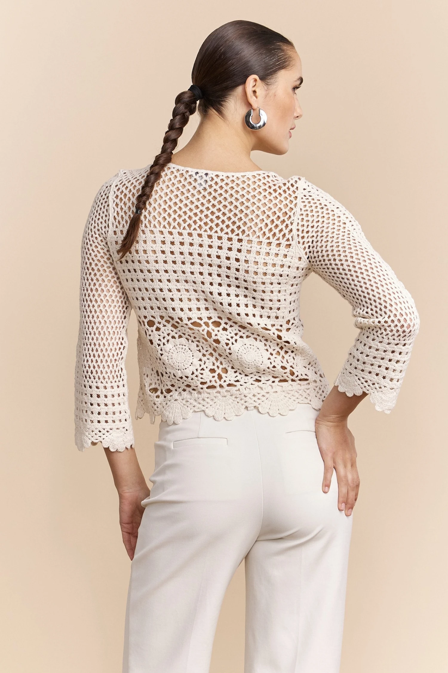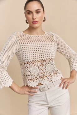 Delve into delicate sophistication with our cotton crochet top—the perfect harmony of comfort and style. Crafted with soft, breathable cotton, this piece offers a gentle touch against your skin and a charming lattice pattern that invites admiration. Ideal for a sunny afternoon or a casual night out, let its airy elegance whisk you away to a place of blissful beauty. Pair it with your favorite jeans or slacks for a seamless look that speaks volumes.
