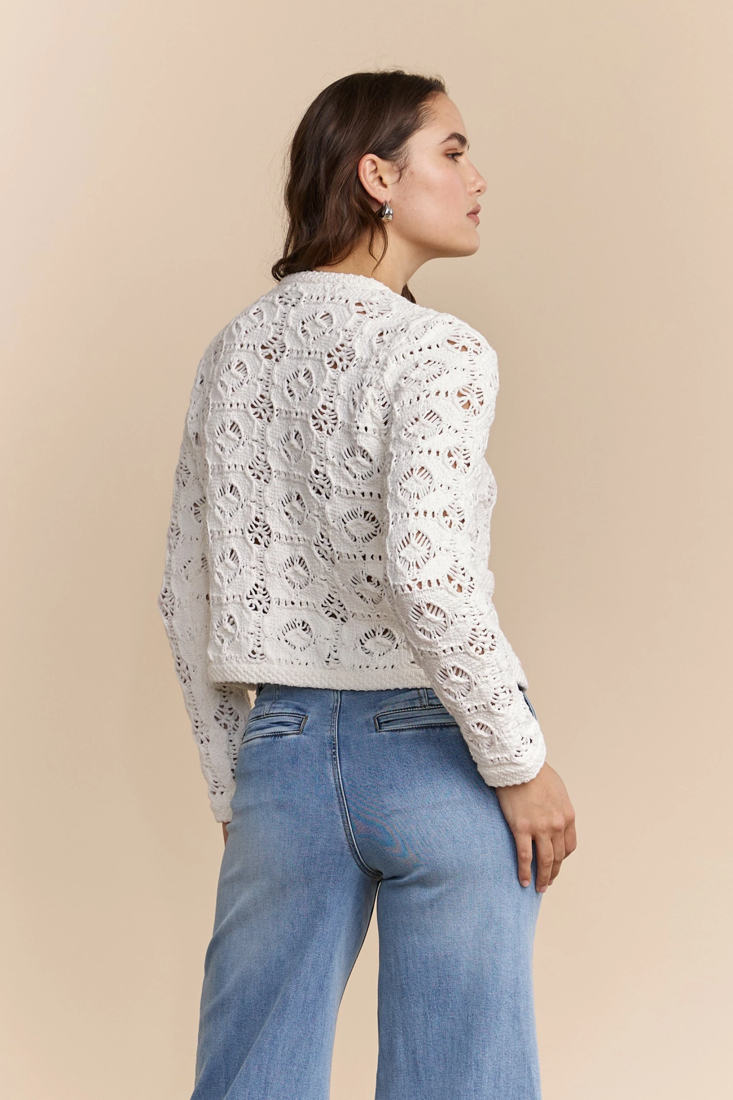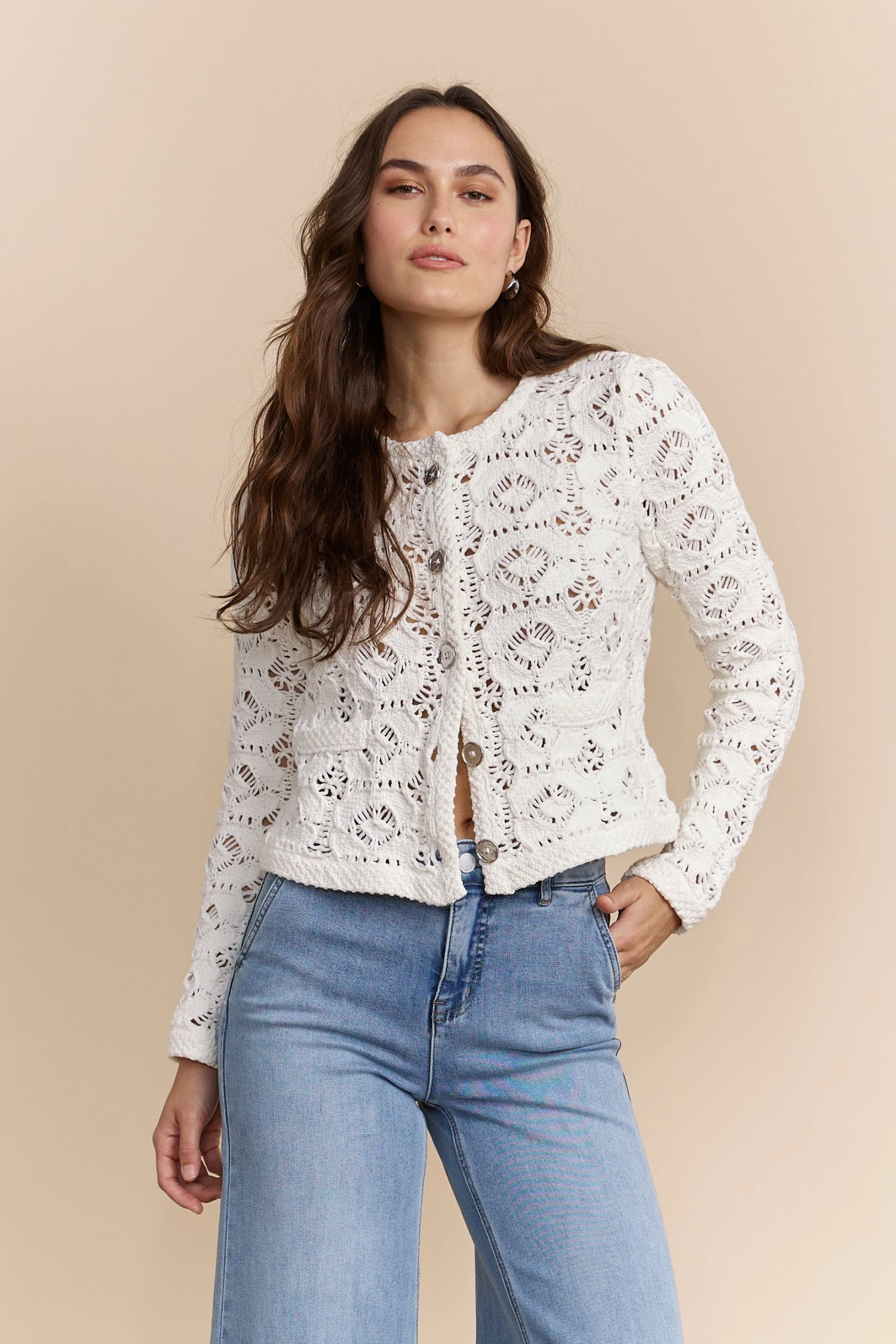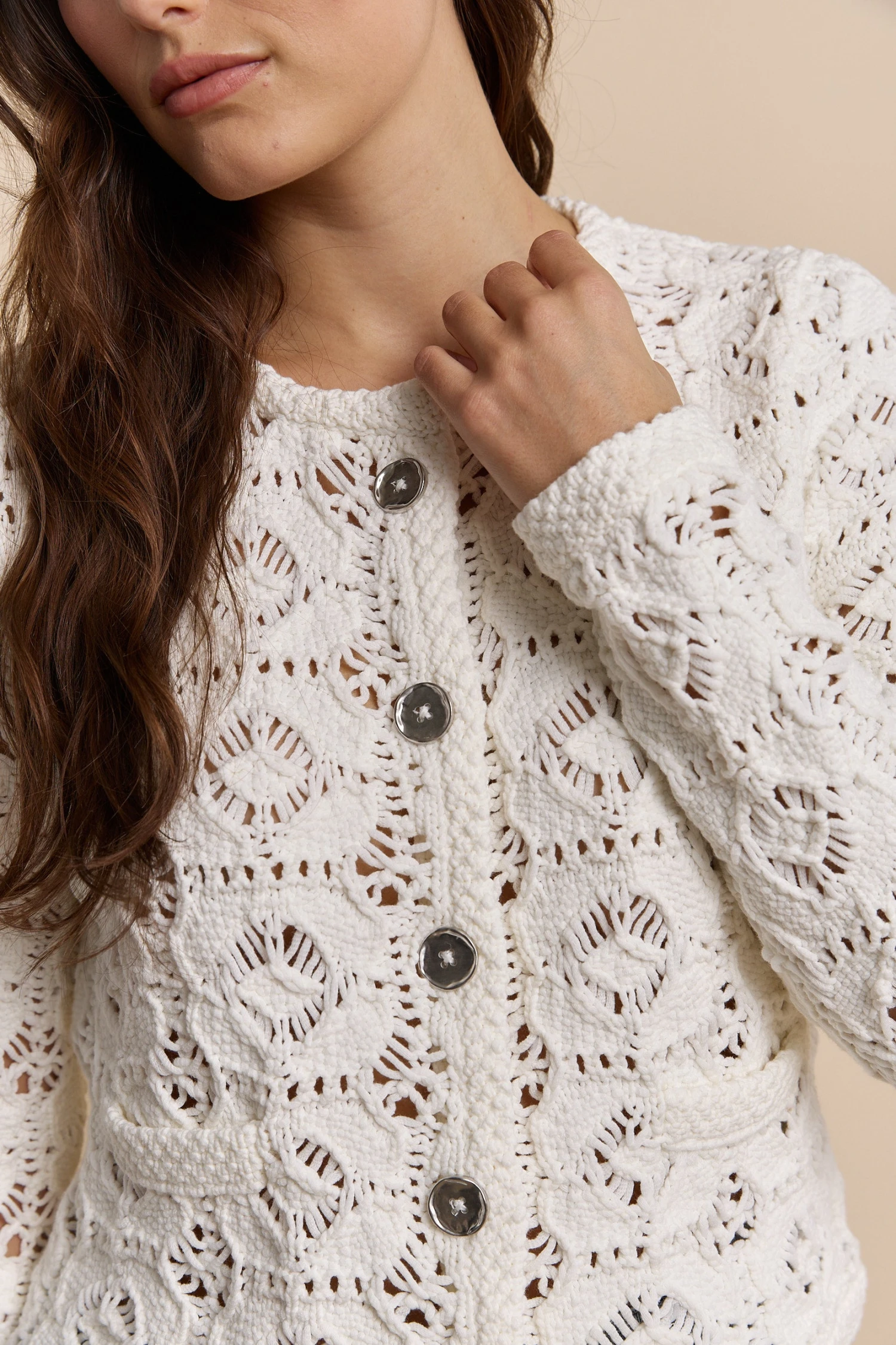 Wrap yourself in style with this crocheted knit cardigan, the perfect piece to add texture to your outfit. Crafted with soft, breathable fibers, it promises comfort for those breezy days. Stand out with a touch of artisanal flair—pair with your favourite denim for timeless style.