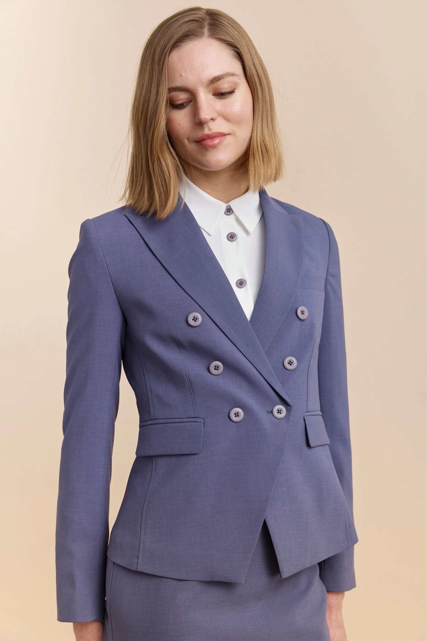 Impeccably tailored for your professional flair, this double-breasted fitted jacket epitomizes sophistication. The rich fabric drapes gracefully, ensuring you feel as good as you look. Ideal for pairing with a sleek skirt or smart trousers, let this jacket be the statement piece that commands respect. Perfectly blended for comfort and style, redefine your wardrobe essentials with a touch of timeless elegance.