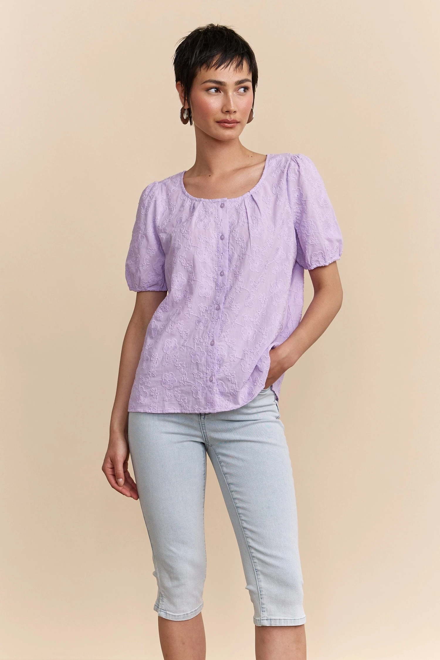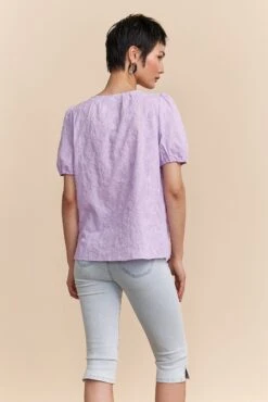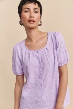 Soft lavender charm meets intricate detailing in this embroidered cotton blouse! Perfect for any occasion, it adds a touch of whimsical elegance to your wardrobe. Style with your favorite jeans or skirts and feel the comfort of breathable cotton, keeping you cool and confident.