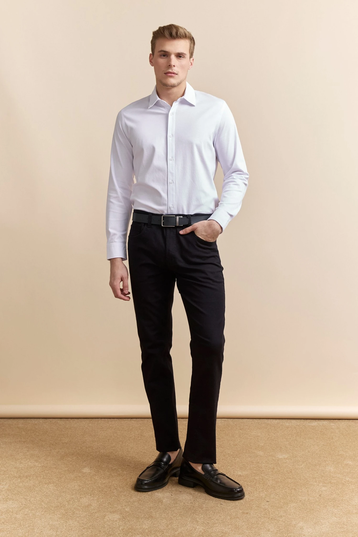 Step out with confidence in these textured slim pants, perfectly designed for the modern gentleman. With five discreet pockets and a sophisticated cut, they’re ideal for both the office and after-hours. The premium fabric promises not just style but also long-lasting comfort, ensuring you look sharp all day. Pair with your favorite shirt and a sleek belt to complete the look.