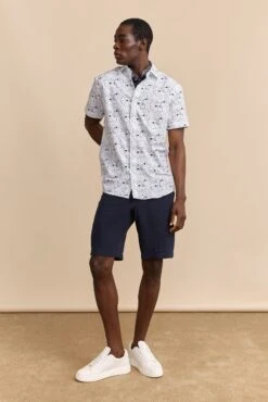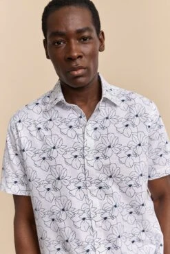 This semi-fitted printed shirt features a subtle floral pattern that adds an elegant, seasonal touch. Crafted from soft, breathable fabric, it offers day-long comfort. Pair it with summer shorts and a paisley bandana tied at the neck for a look that’s both refined and relaxed.