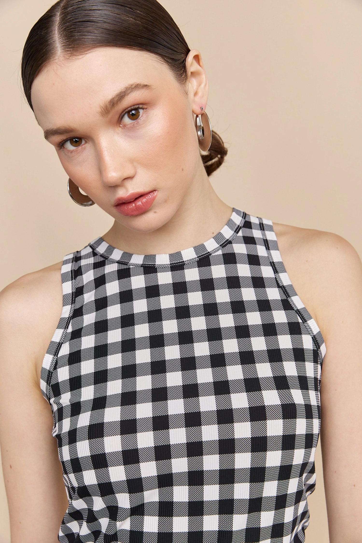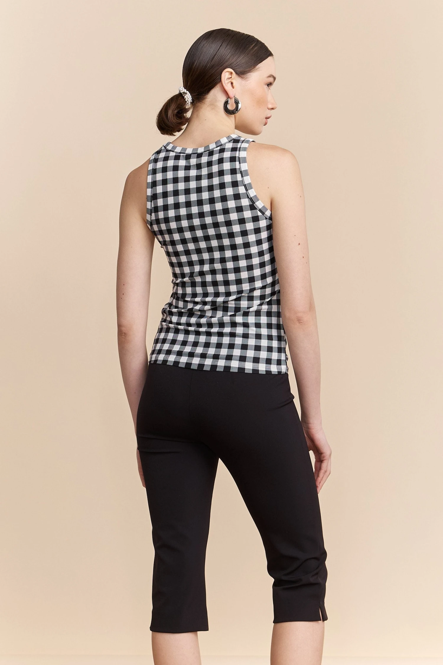 Classic charm meets modern style with this gingham check sleeveless top! Perfect for the fashion-forward trendsetter, its snug fit and breathable fabric can be dressed up or down. Team it with tailored capris for a sleek office look, or with jeans for a weekend brunch.