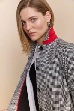 Step out in confidence with our houndstooth-patterned coat. A key piece of the spring wardrobe, it blends timeless elegance with modernity. Every detail tells a story—from its refined pattern to its striking red collar and elegant buttons. A must-have for a sophisticated wardrobe, it’s perfect for layering. Pair it with micro shorts or a sleek dress for a chic and versatile look.