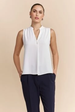Sleek and sophisticated, this sleeveless top adds a touch of modern minimalism to your wardrobe essentials. Made from soft jersey fabric, it drapes beautifully, making it a perfect partner for both tailored trousers and relaxed denim. The crisp, clean lines and subtle neckline offer just the right amount of elegance for any occasion.