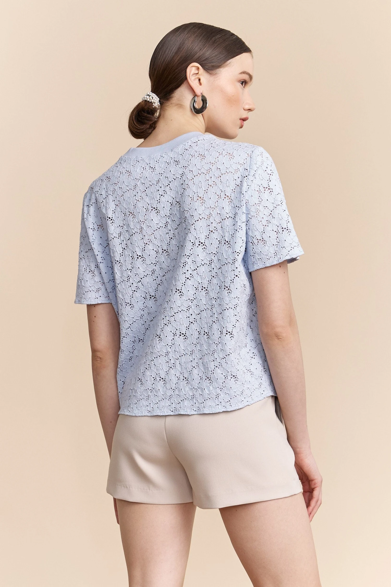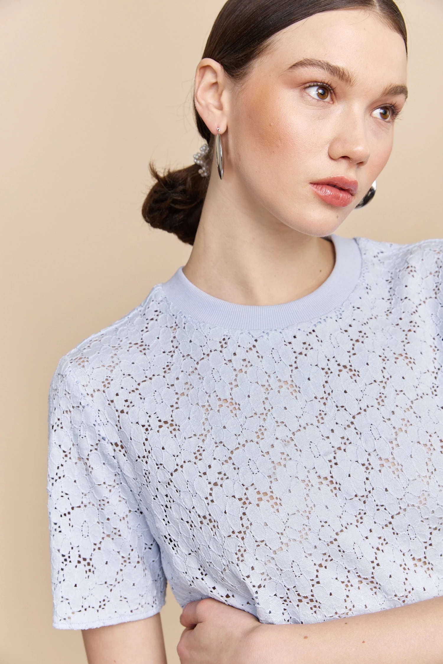 Unveil your chic side with this lace boxy short sleeve top, perfect for adding texture and flair to any ensemble. Its delicate lace offers a soft, breathable feel — ideal for breezy summer days or layered for a sophisticated evening look. Designed for the modern fashion enthusiast, this pastel top pairs seamlessly with tailored shorts or your favorite jeans.
