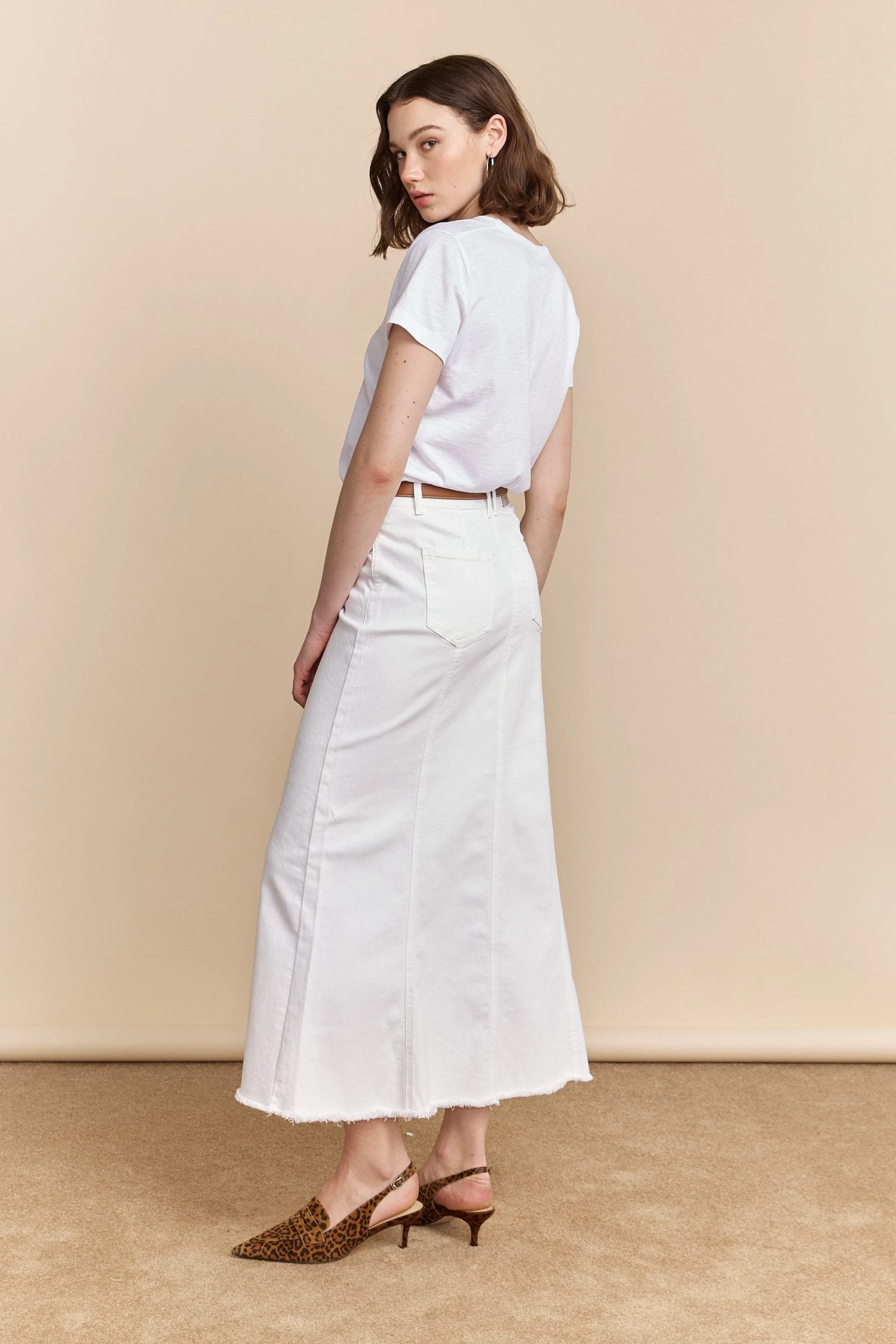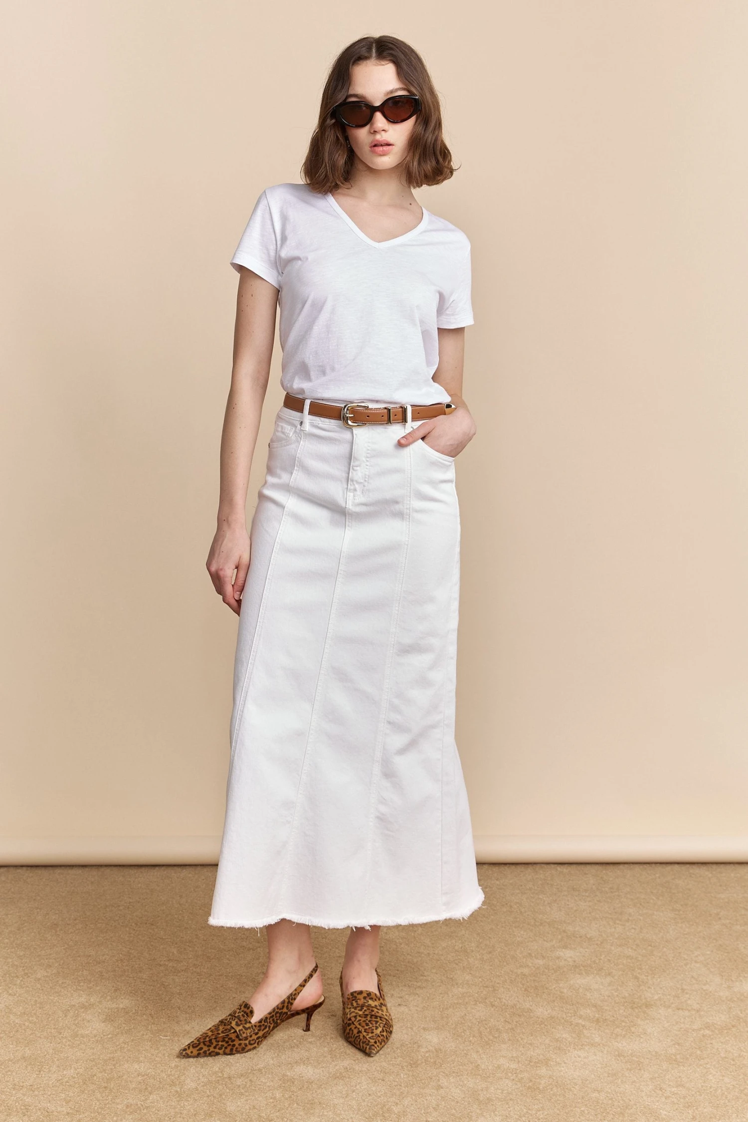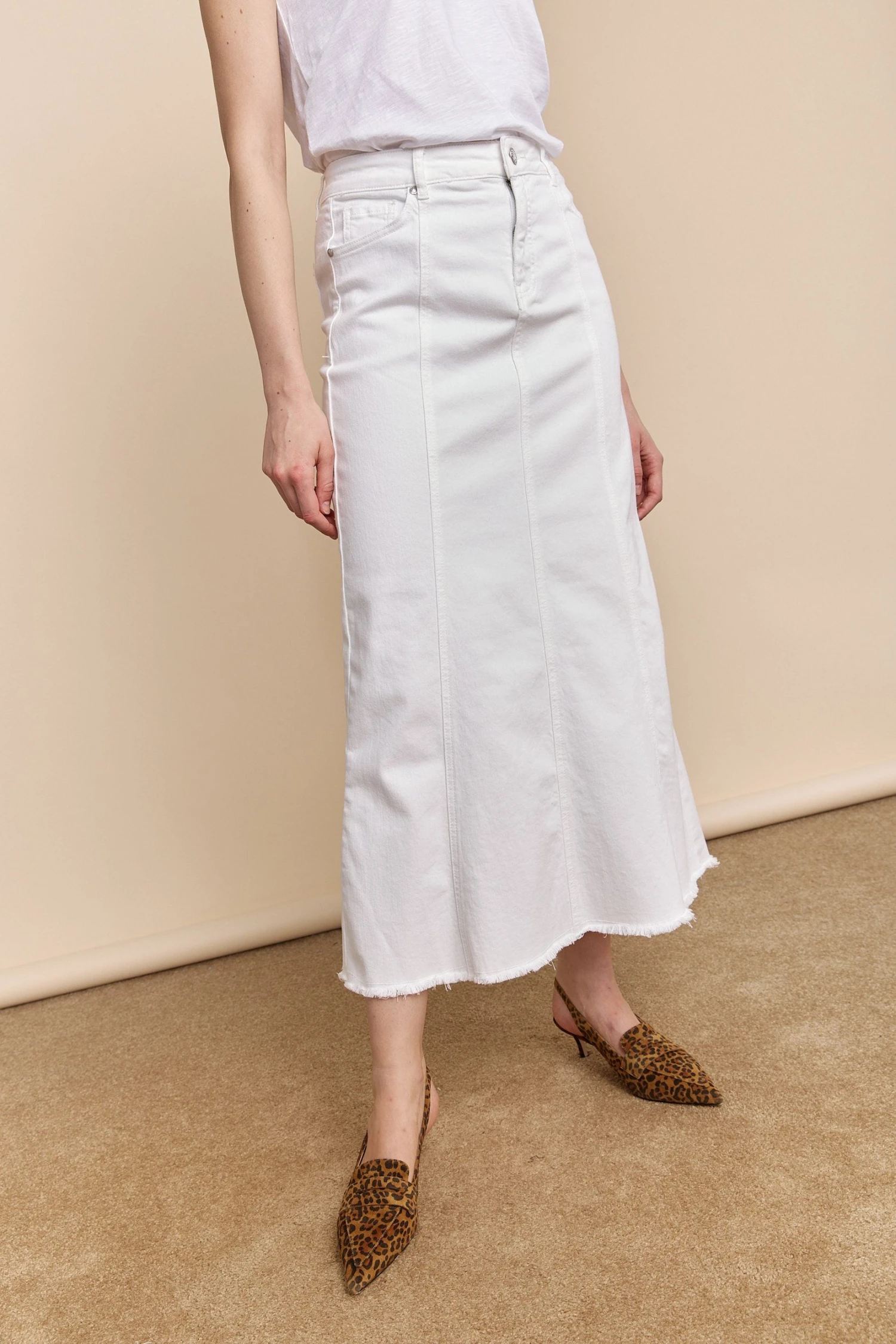 This long denim skirt is your ticket to understated elegance. Crafted from premium material, it offers the perfect blend of structure and flow, making it a staple for any season. The crisp white denim pairs beautifully with your favorite blouse or jacket, while the raw hem adds a touch of contemporary flair. Ideal for the trendsetter who values both fashion and versatility, this skirt promises to be a timeless addition to your wardrobe.