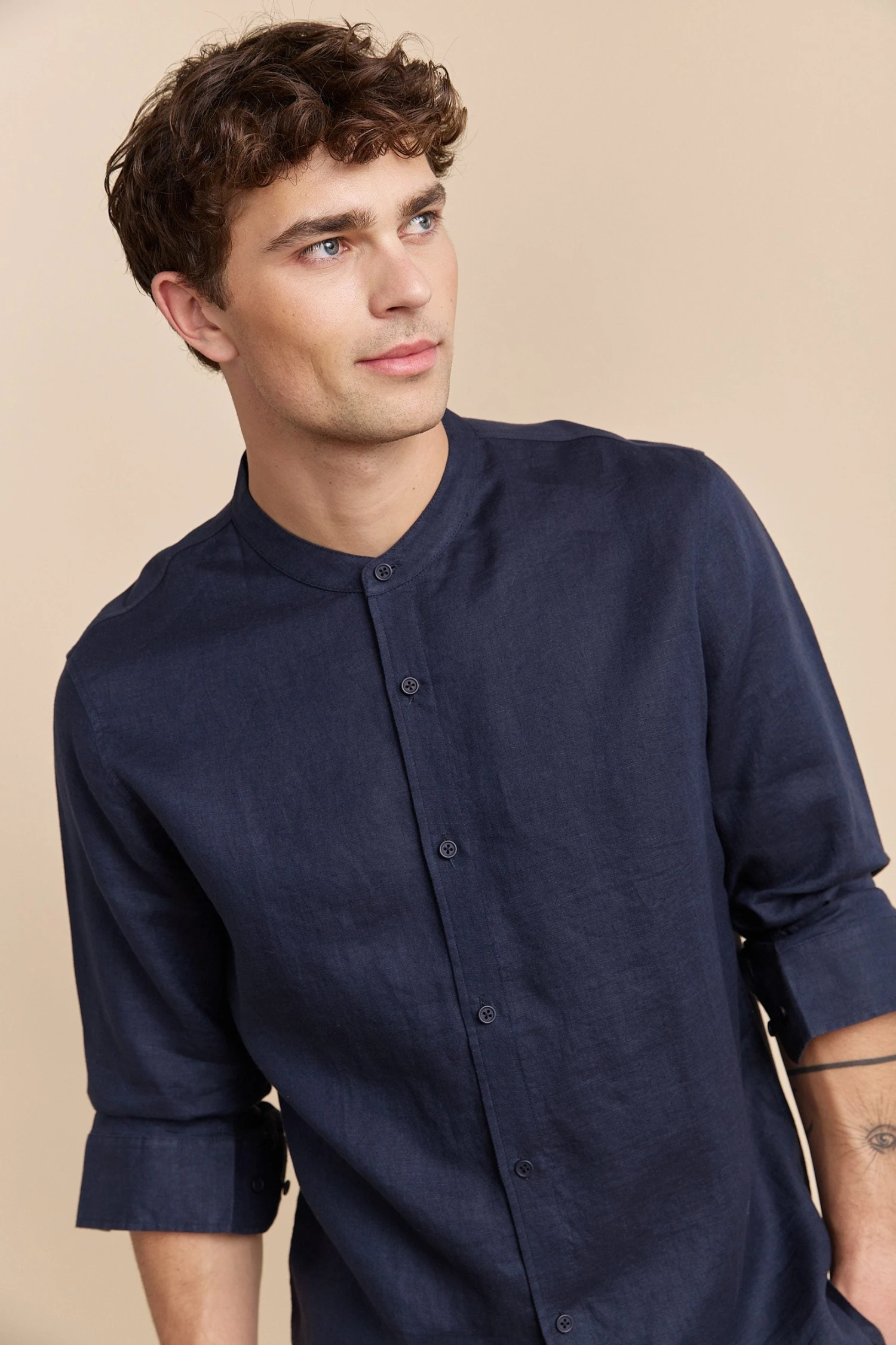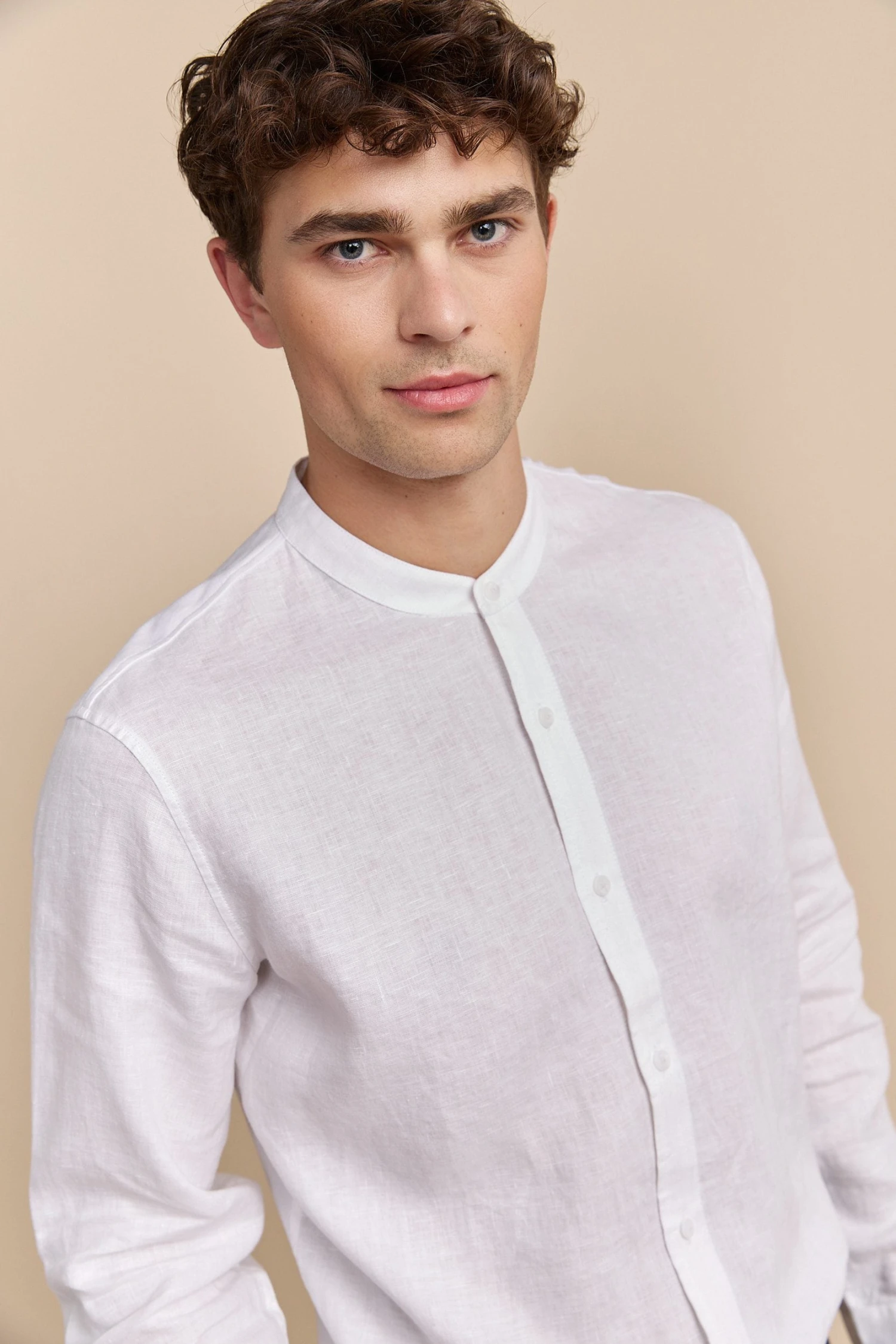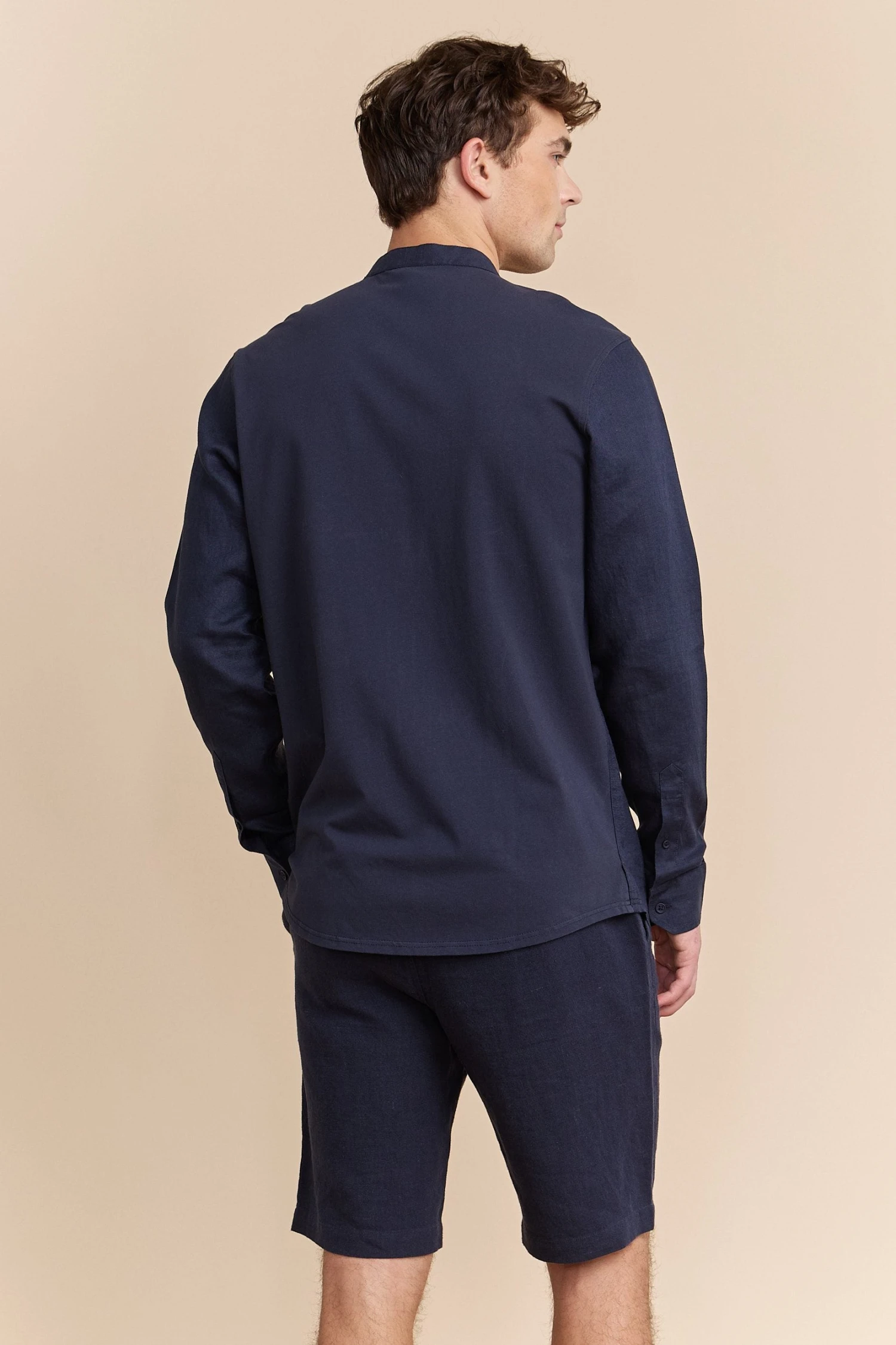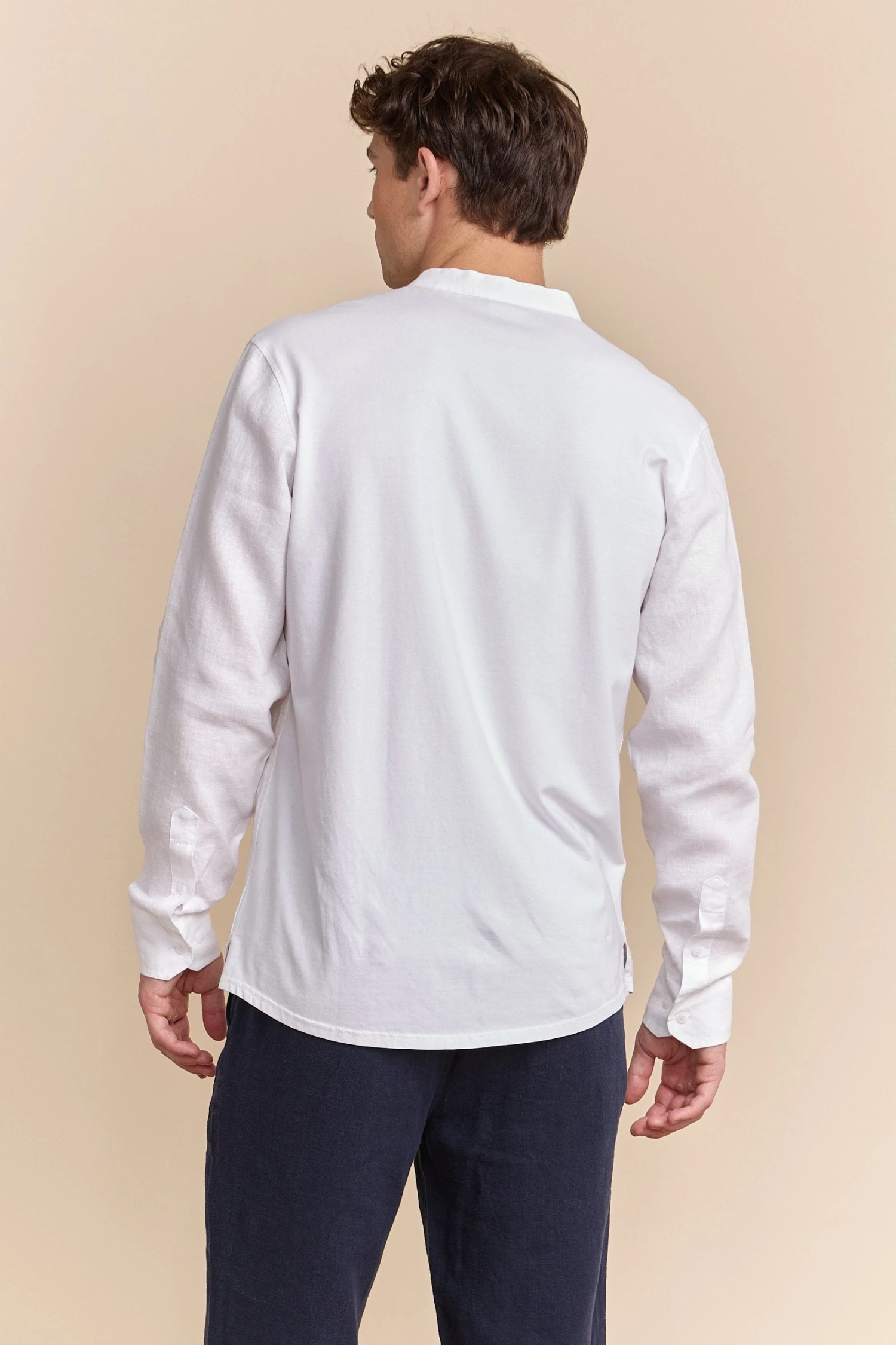 Opt for understated elegance with this Mao collar shirt. Its linen front and fitted jersey back provide all-day freshness and comfort. Versatile, it transitions effortlessly from casual brunches to dressier occasions.