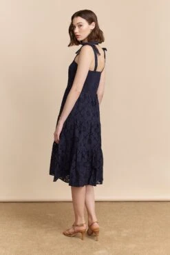 This charming navy sundress, perfect for a wedding and festive evenings, enchants with its intricate eyelet detailing and feminine bows. Ignite spontaneity and feel the soft fabric fluttering like a gentle summer breeze, free from worry and full of delight.