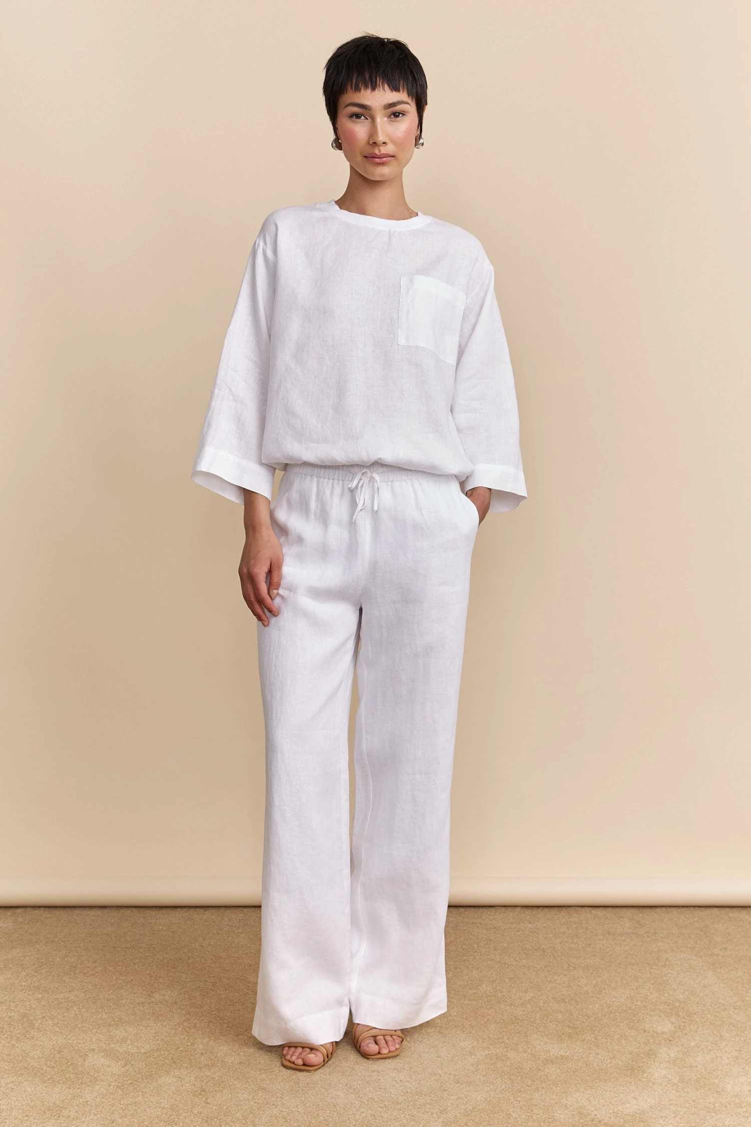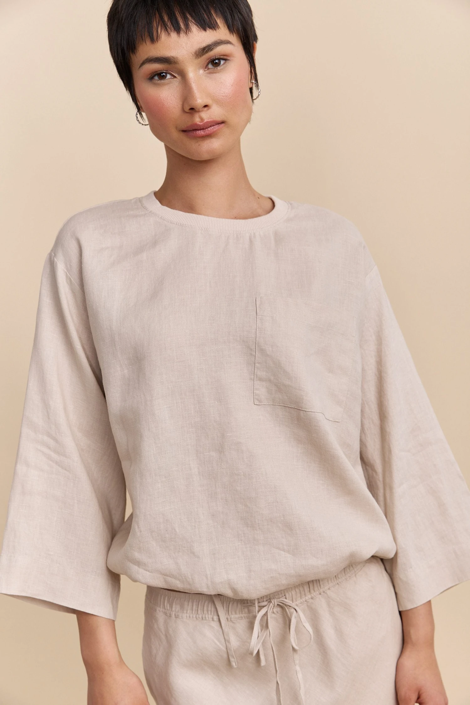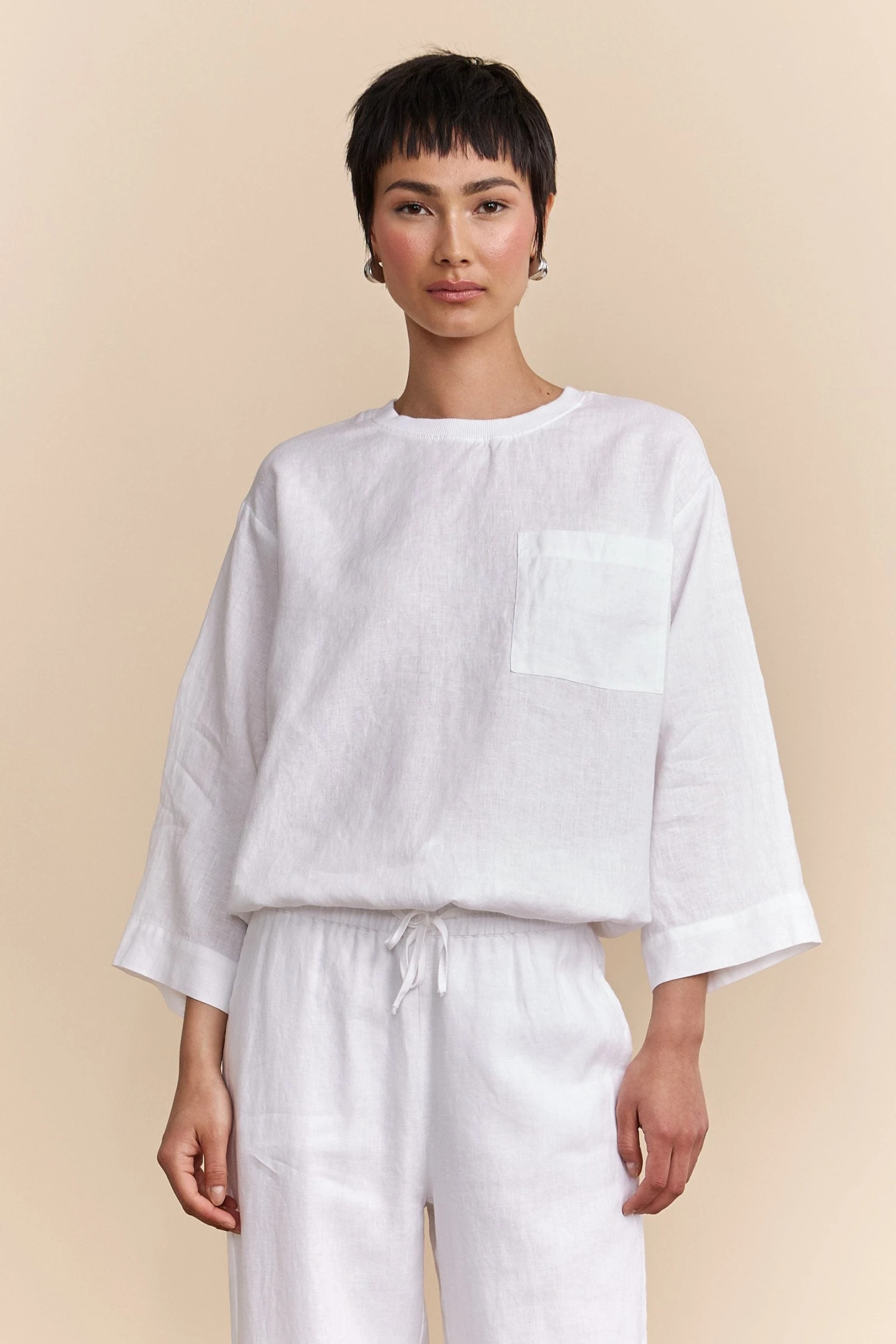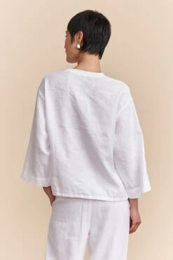 Feel the airiness of summer with oversized drawstring top, ideal for casual walks or impromptu getaways. It effortlessly combines comfort with chic appeal, offering a fluid silhouette and understated sophistication. Crafted from breathable linen, it ensures absolute lightness. Pair it with the matching pants or skirt for a flawless, harmonious look.