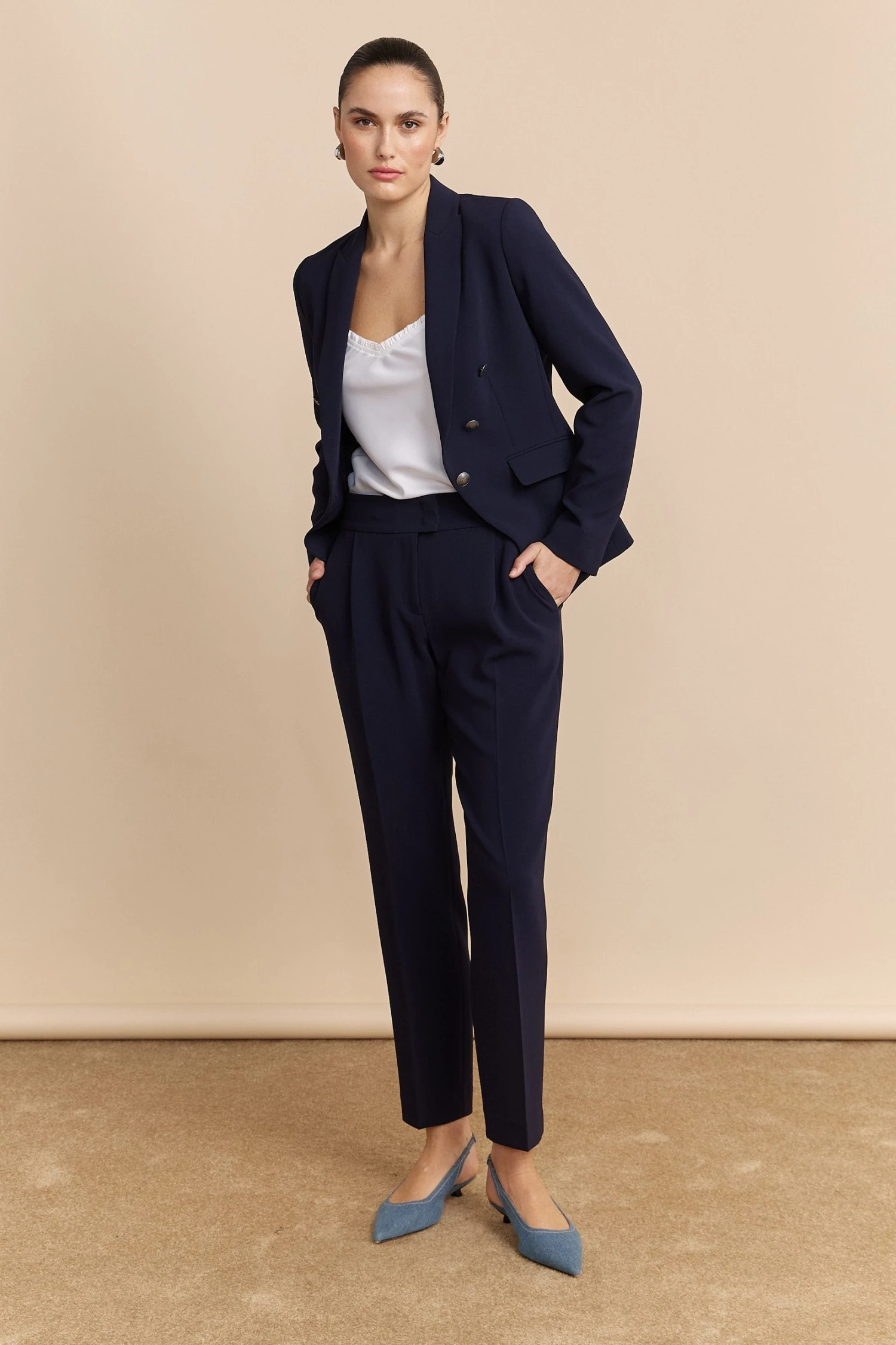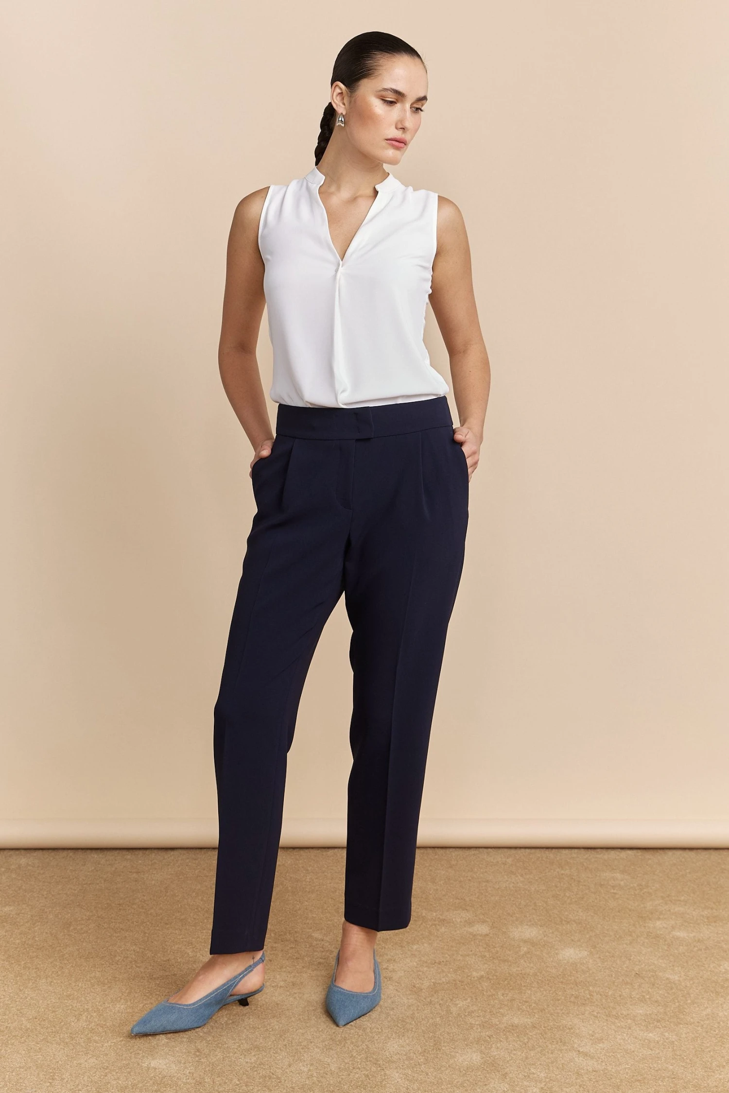 These sleek trousers are crafted for the modern professional who values both style and comfort. With their clean lines and flattering silhouette, they transition effortlessly from boardroom to after-hours. Confidence, built into every seam.