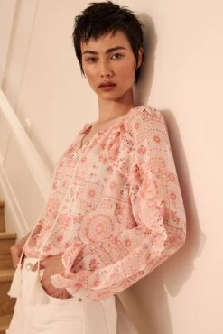 Make a statement with this whimsically printed blouse. Crafted from airy fabric and finished with delicate frills, it brings lightness and femininity to your look. The front tie and printed design add a romantic feel, perfect for any occasion. Pair it with jeans or a skirt for a naturally elegant ensemble.