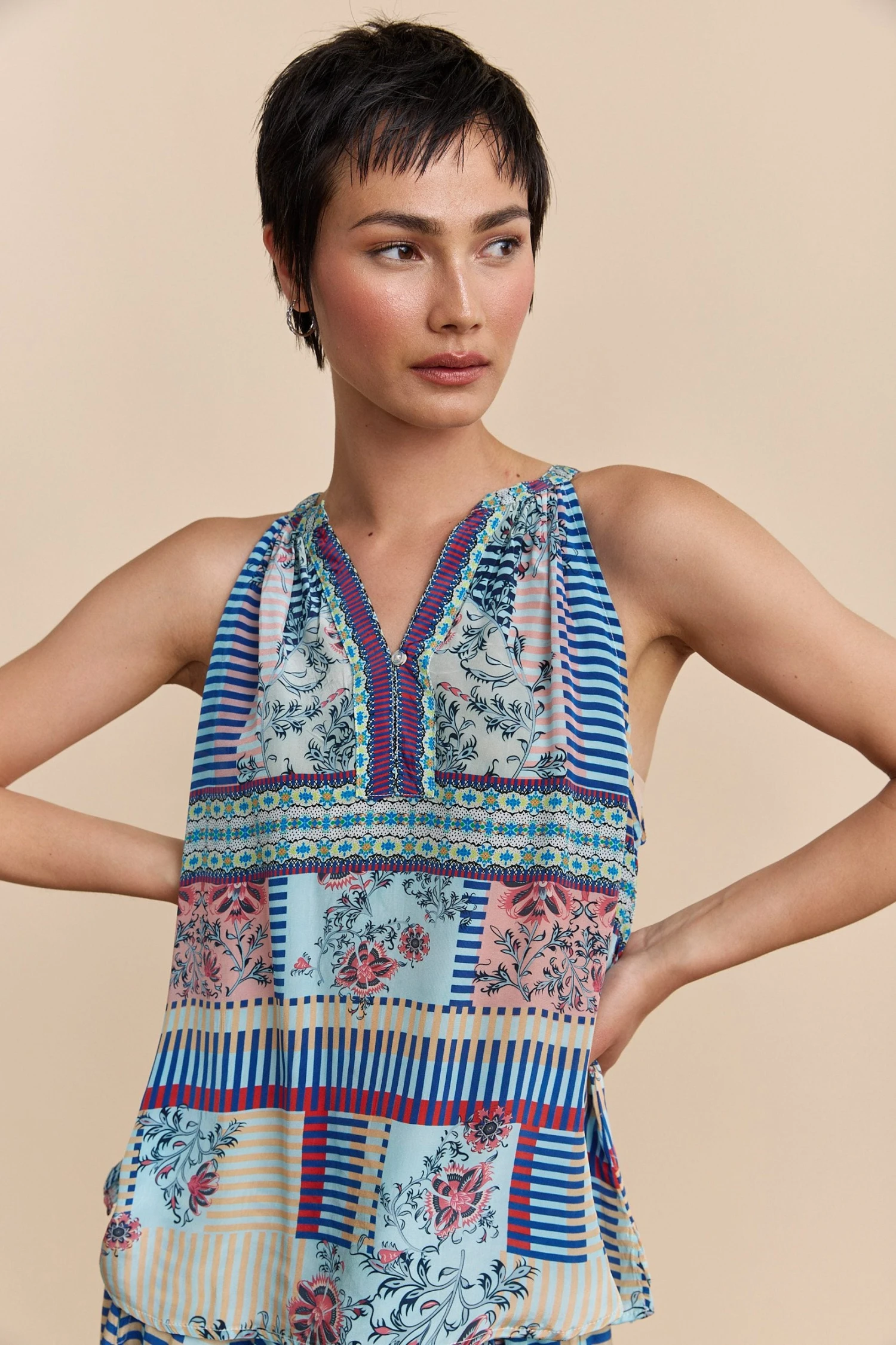 Discover this flowy printed halter top that beautifully balances colour and design! This vibrant piece is crafted from breathable fabric, ensuring comfort and chic style for warm days. Perfect to pair with jeans or a matching skirt for a statement look.