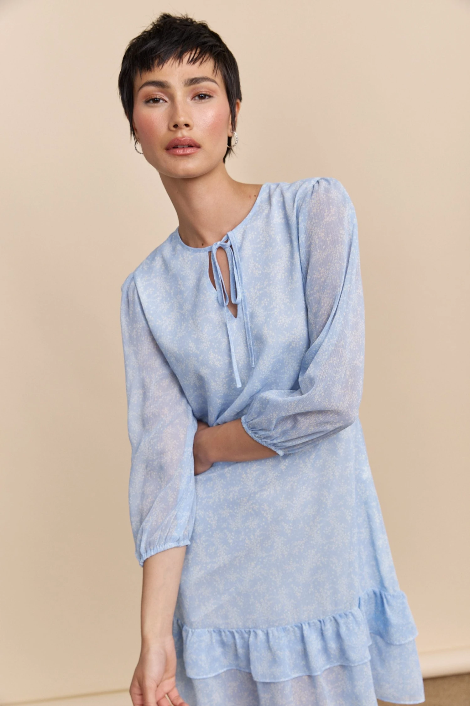Lightweight and flattering, this floral print flowy dress is perfect for summer. Made from a soft, breathable fabric, it offers all-day comfort while enhancing every silhouette. The semi-sheer puff sleeves add a romantic touch, and the adjustable front tie lets you customize the neckline.