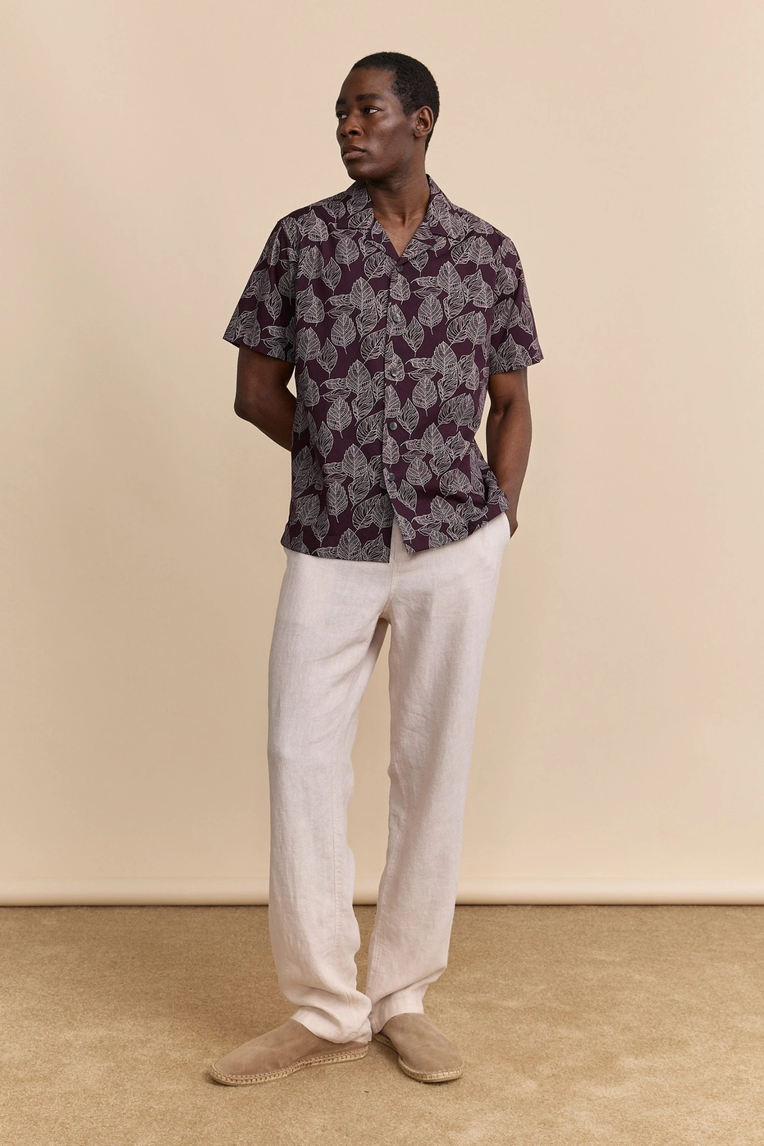 This Cuban collar shirt with a foliage print blends refined style with natural ease. Its subtle pattern adds character without sacrificing elegance, making it perfect for elevating summer outfits. Crafted from lightweight, breathable fabric, it ensures optimal comfort for everything from a casual business brunch to a relaxed day out.