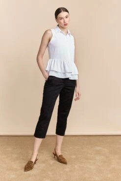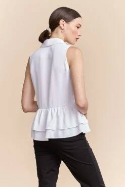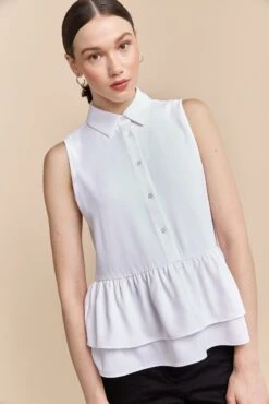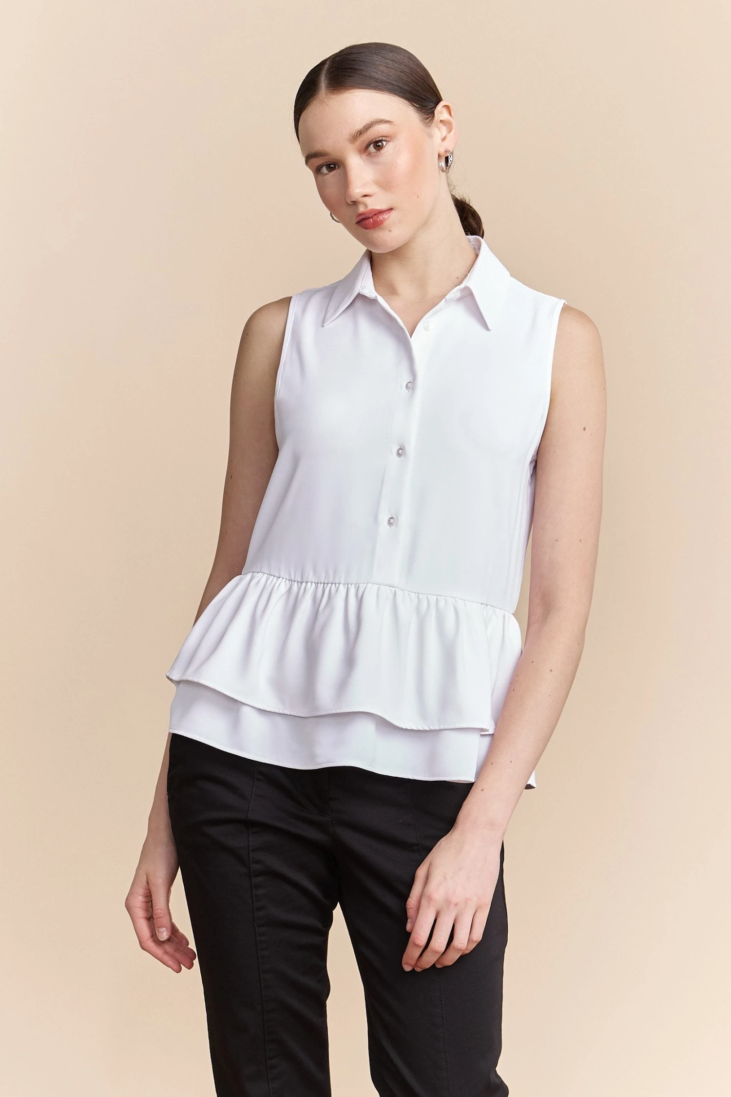 Chic meets comfort in this sleeveless blouse! Featuring playful ruffles at the bottom, this piece is crafted from a soft fabric that feels delightful against the skin. Perfect for both work and weekend brunches, it adds a touch of elegance with its tailored fit and button-down design. Pair with jeans or a pencil skirt for a polished look that’s inherently you.