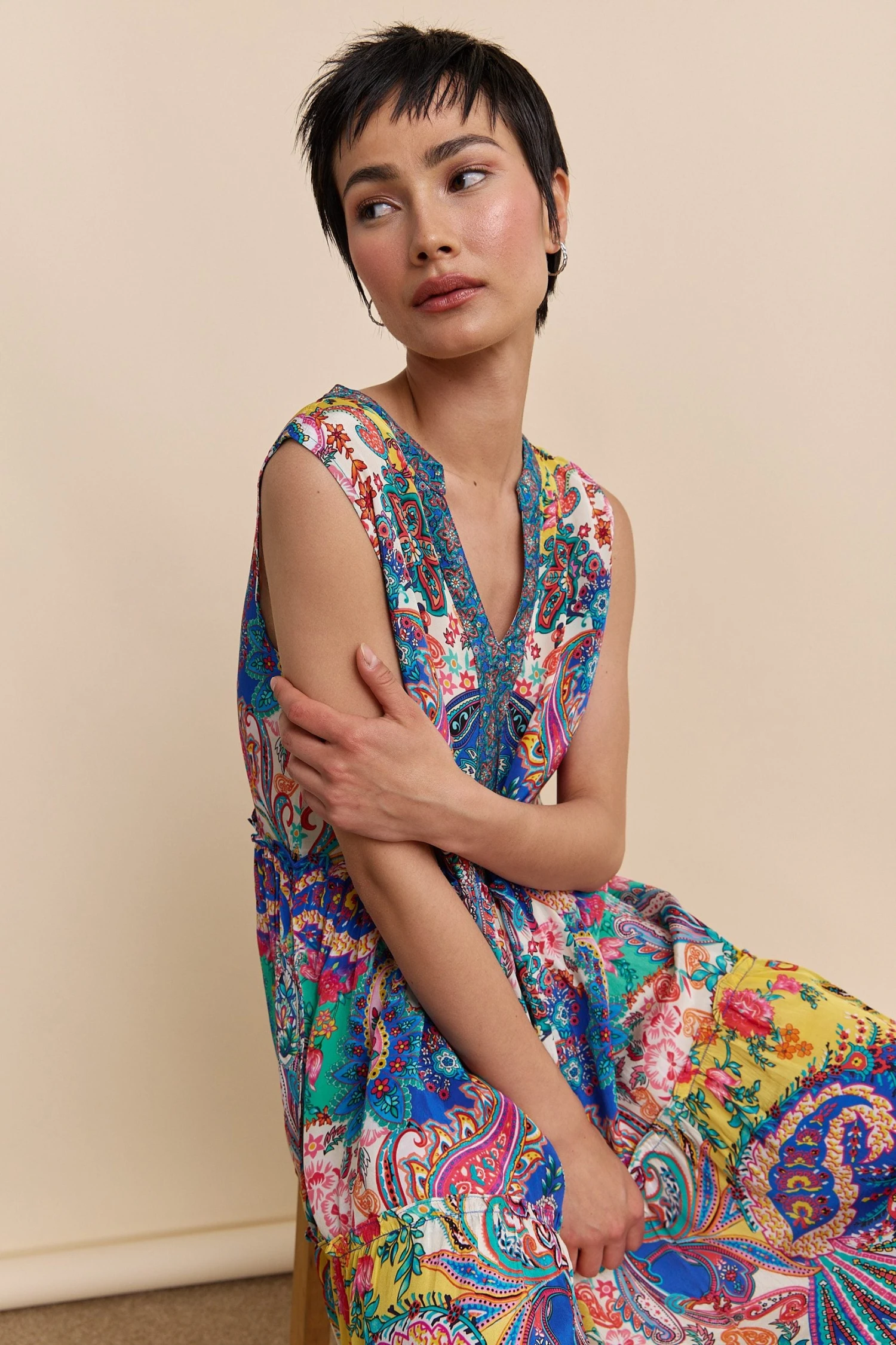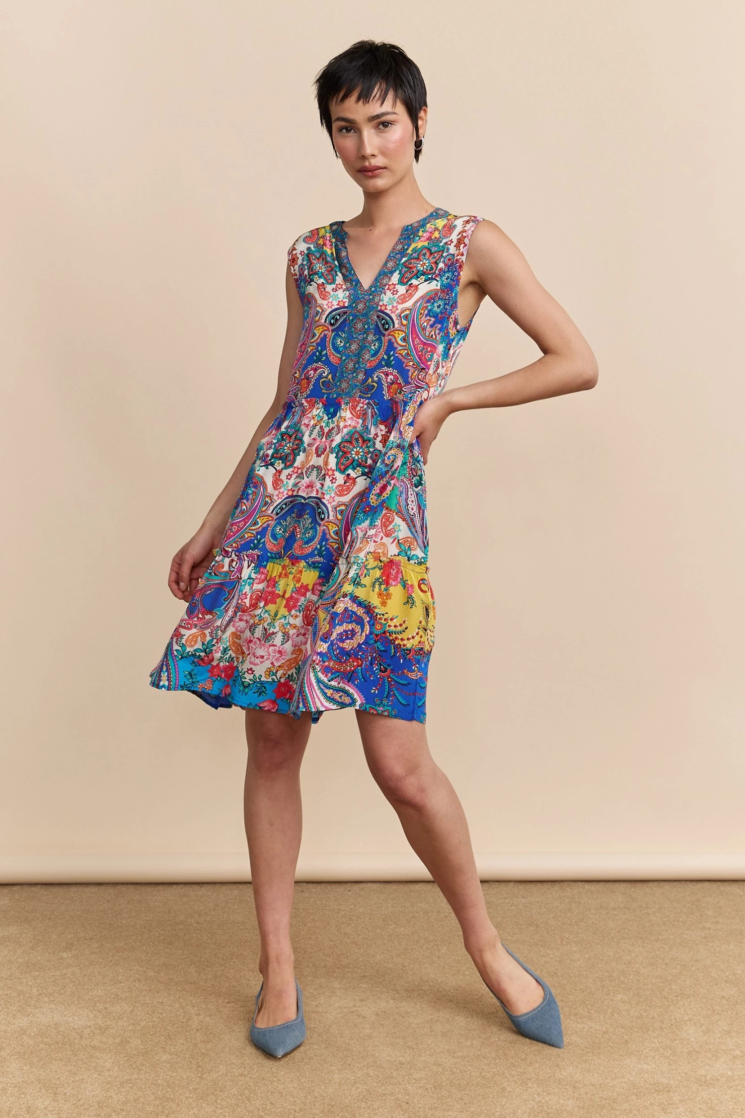 Combining refinement and femininity, this sleeveless dress stands out with its vibrant floral and paisley print. The V-neckline and fluid, ruffled silhouette create a flattering shape with graceful movement. Crafted from a lightweight, comfortable fabric, it offers effortless elegance and easy care.