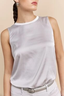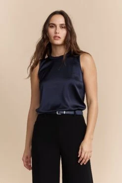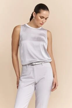 Bring a touch of sophistication to your wardrobe with our sleek sleeveless top. Crafted with a delicate rib detail, its lustrous finish and fluid drape ensure a look that’s both modern and refined. The perfect piece to pair with your favorite denim or a flowing skirt, it’s ideal for any stylish pursuit.