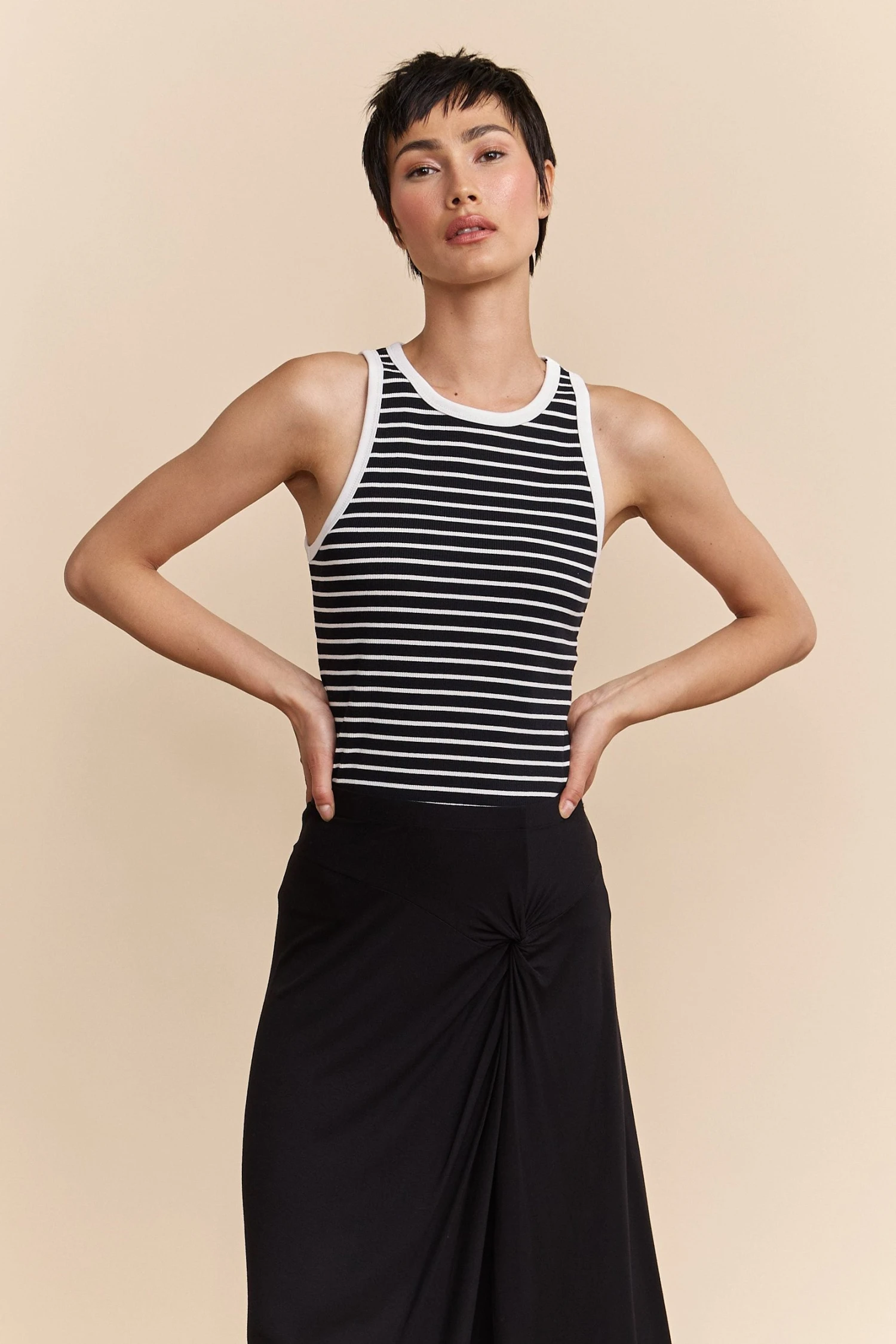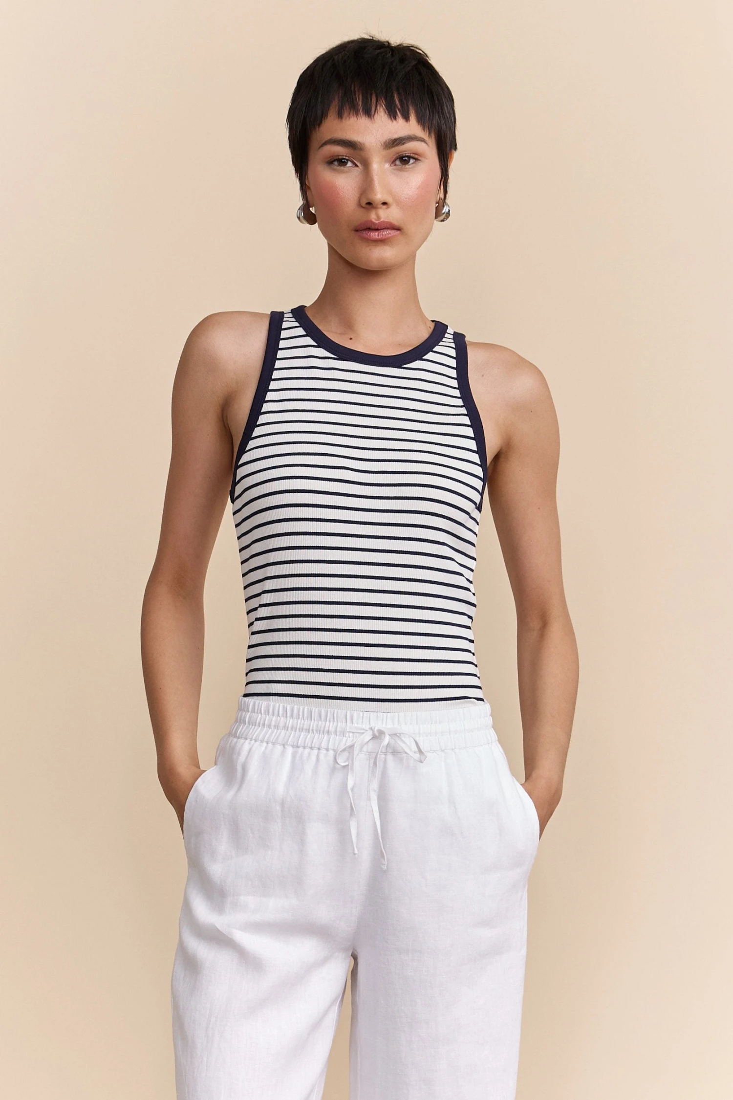 This striped sleeveless top is a must-have for those who appreciate subtlety in their everyday style. Made from soft, breathable cotton, it ensures all-day comfort, perfect for a brunch or a casual outing. Pair it with high-waisted pants or a skirt for a chic seaside-inspired look.