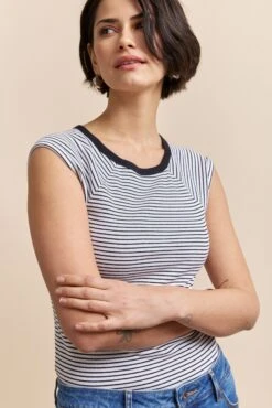 Treat yourself to an effortless look with this striped ribbed t-shirt! Seamlessly combining comfort and style, it pairs perfectly with your favourite jeans. For a touch of modern sophistication, just add a blazer!