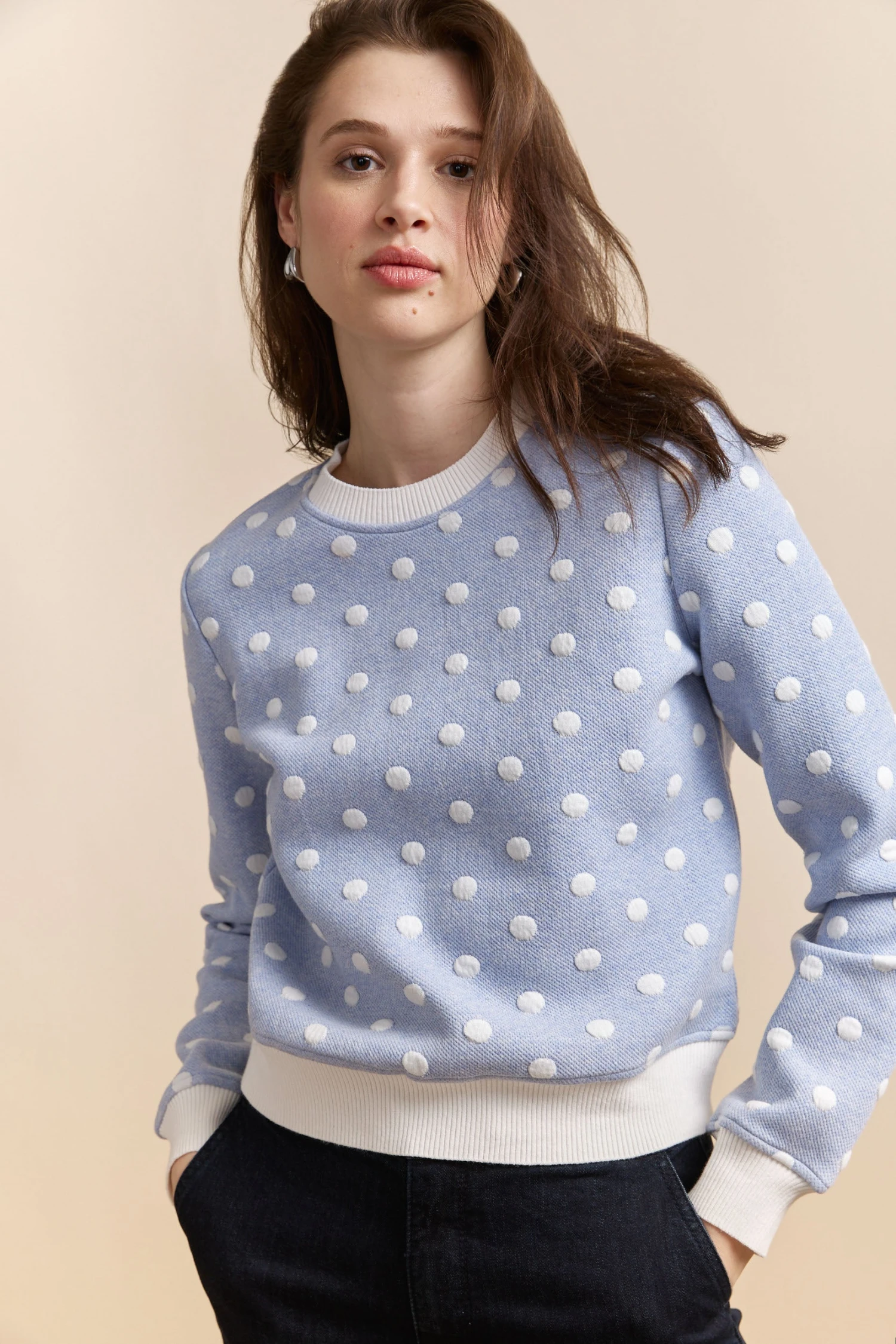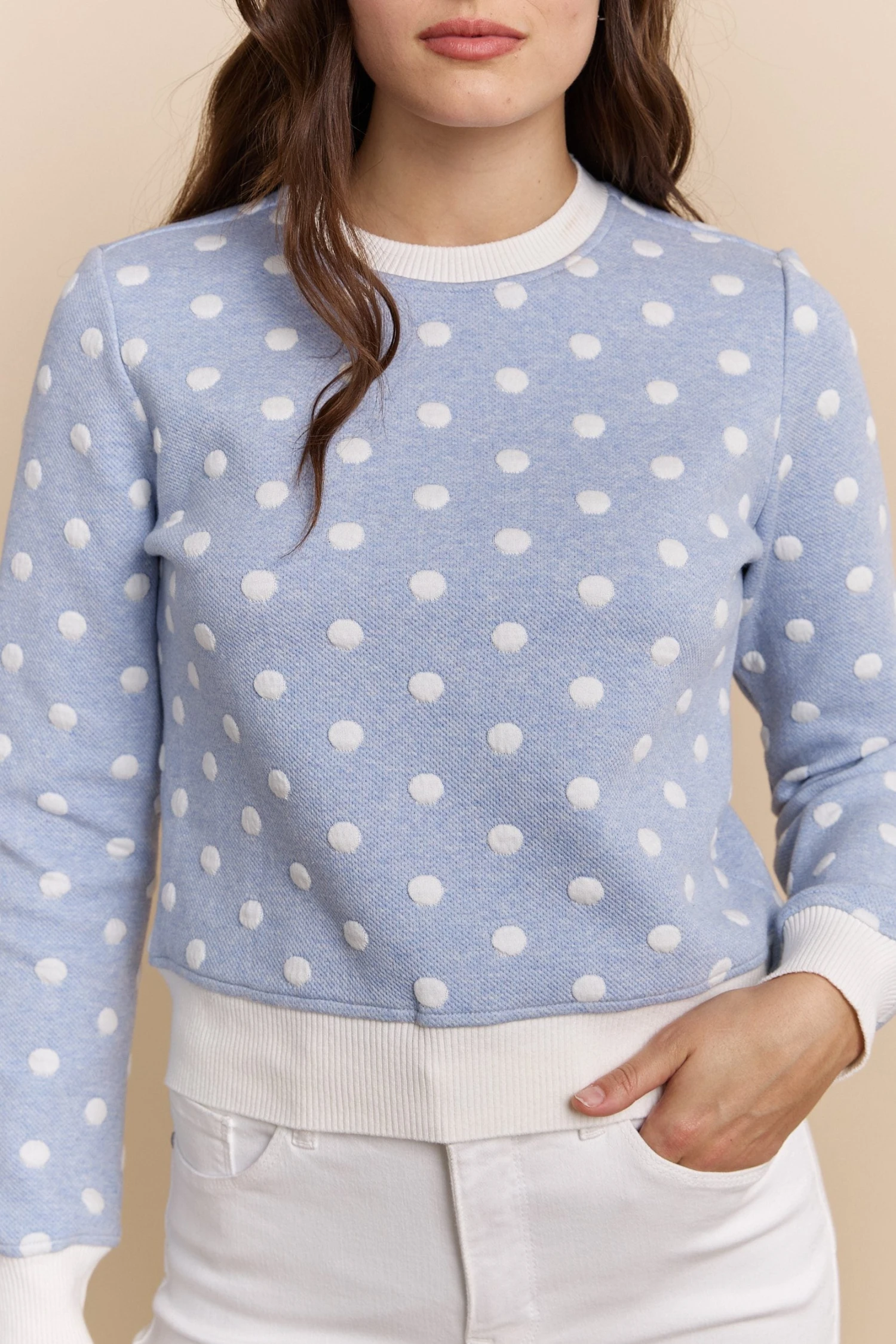 Stay cozy and fashionable with this textured polka-dot crew neck sweatshirt! Its soft, breathable fabric promises comfort, while the playful pattern adds a touch of whimsy to any outfit. Perfect for weekends or casual outings, this sweatshirt defines casual chic with a modern twist.