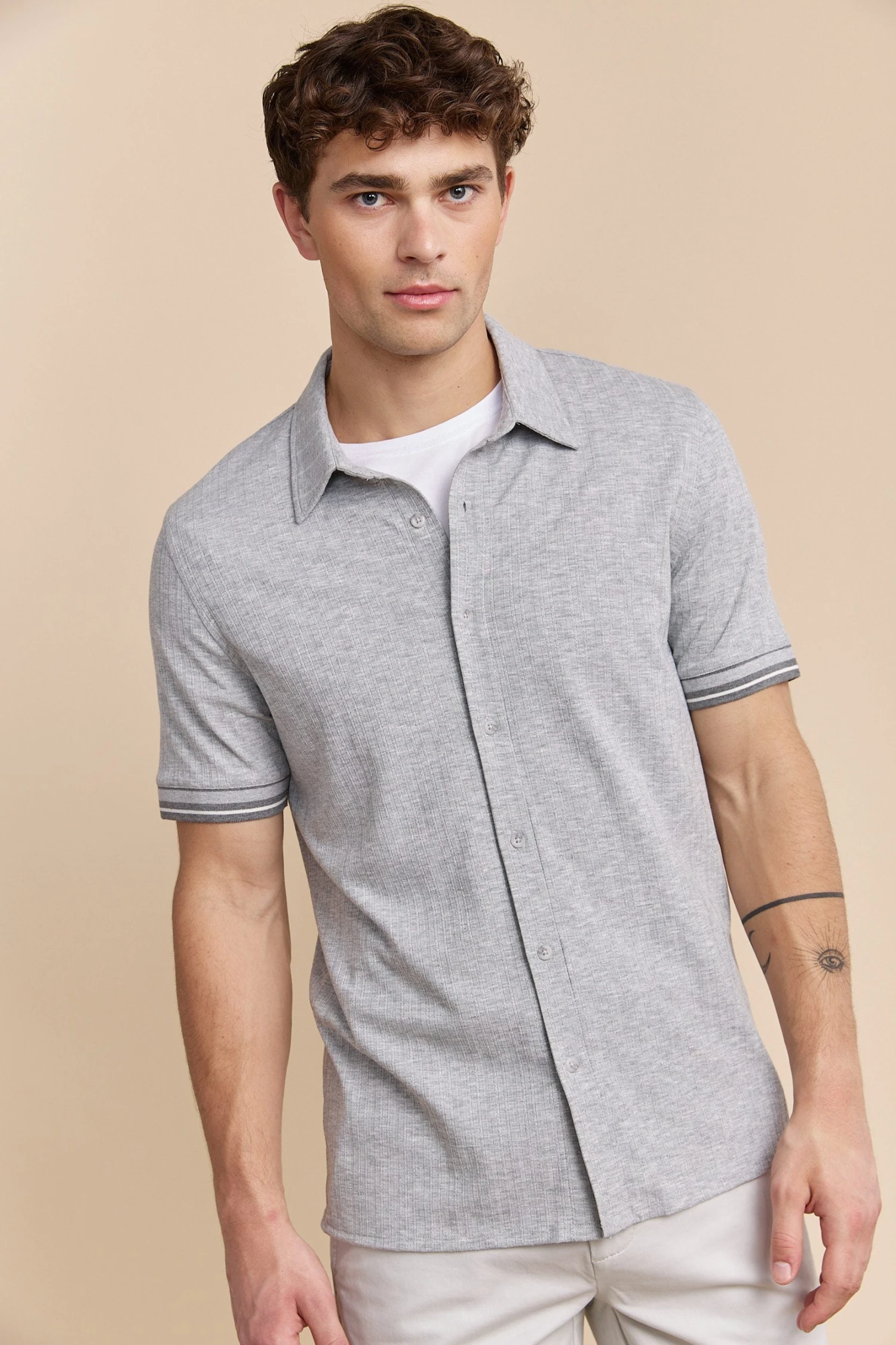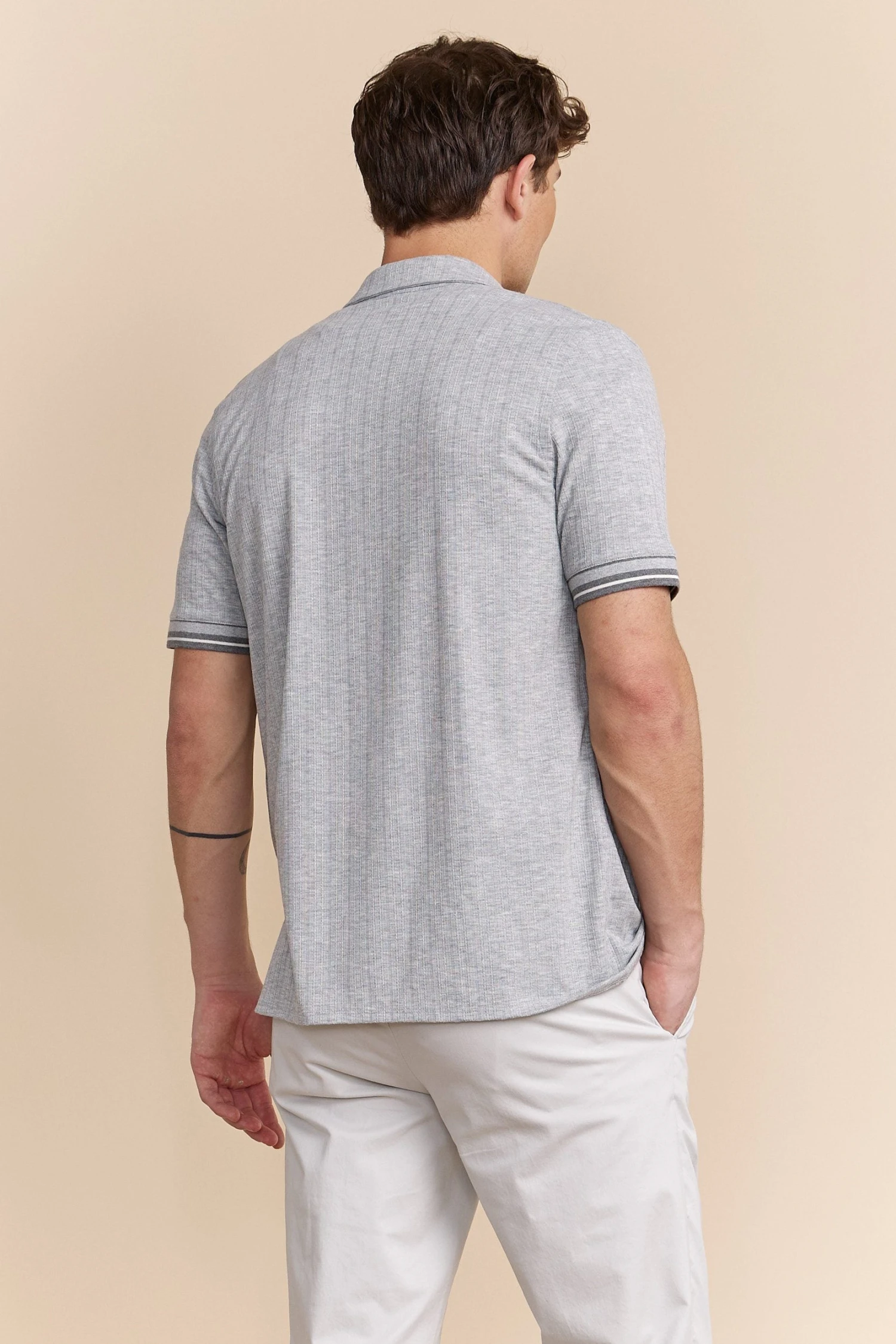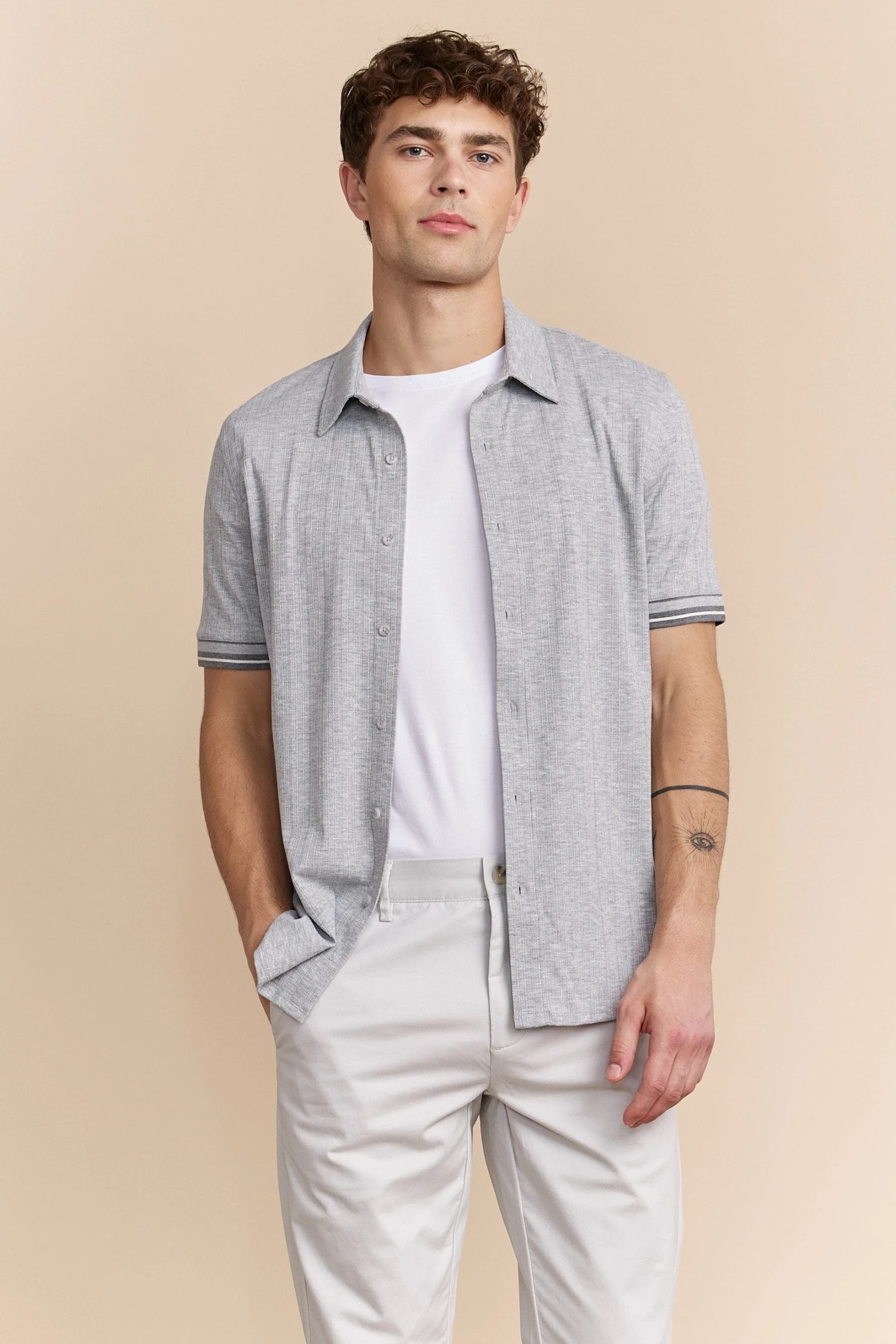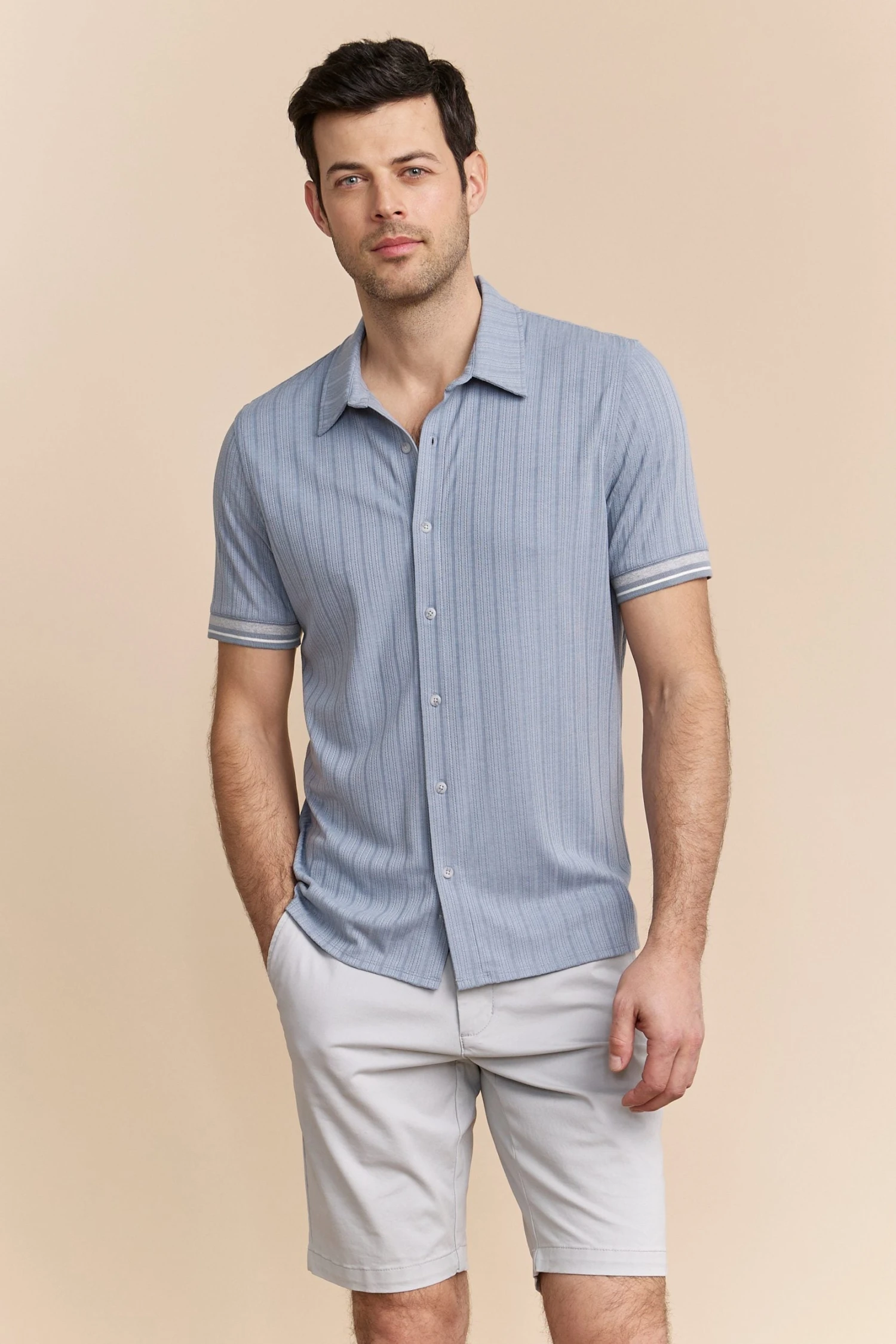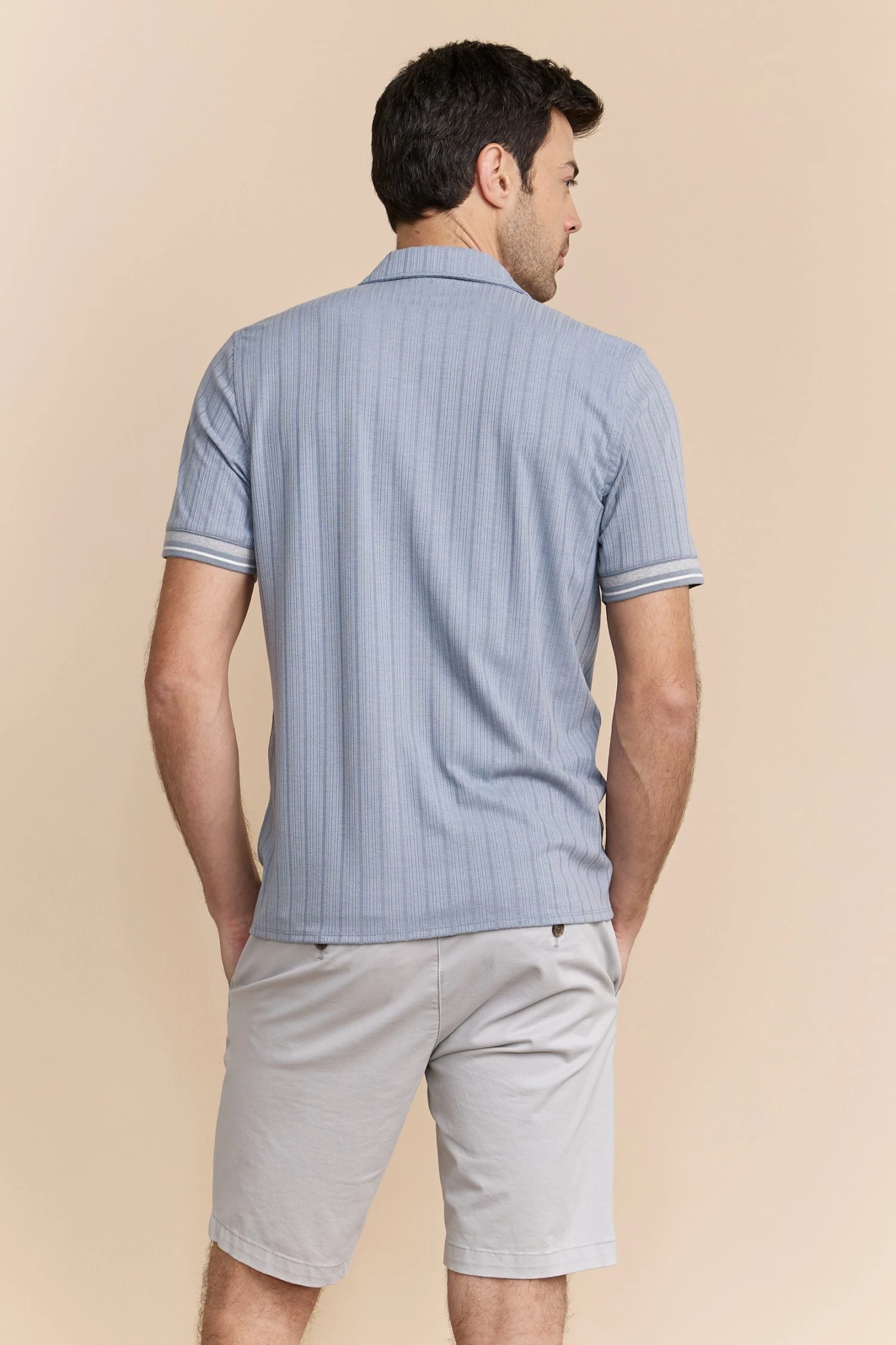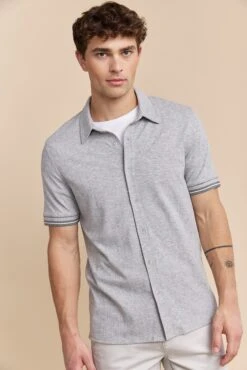 Capture sophistication with our textured ribbed jersey shirt! Perfect for any occasion, its sleek design offers both comfort and style, thanks to the soft, breathable fabric. Pair with tailored shorts or trousers for a polished look wherever you go.