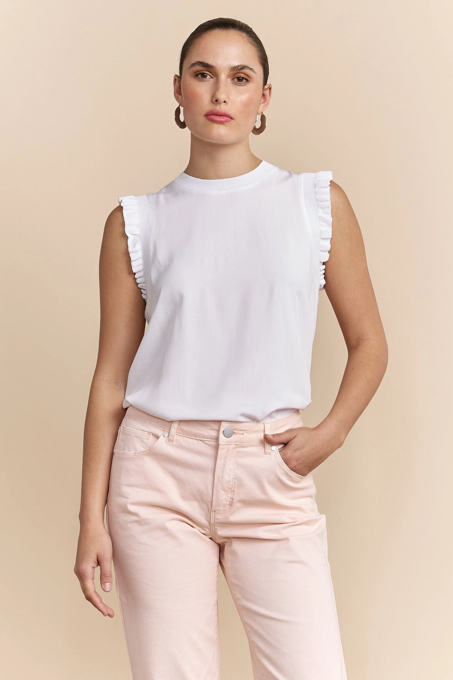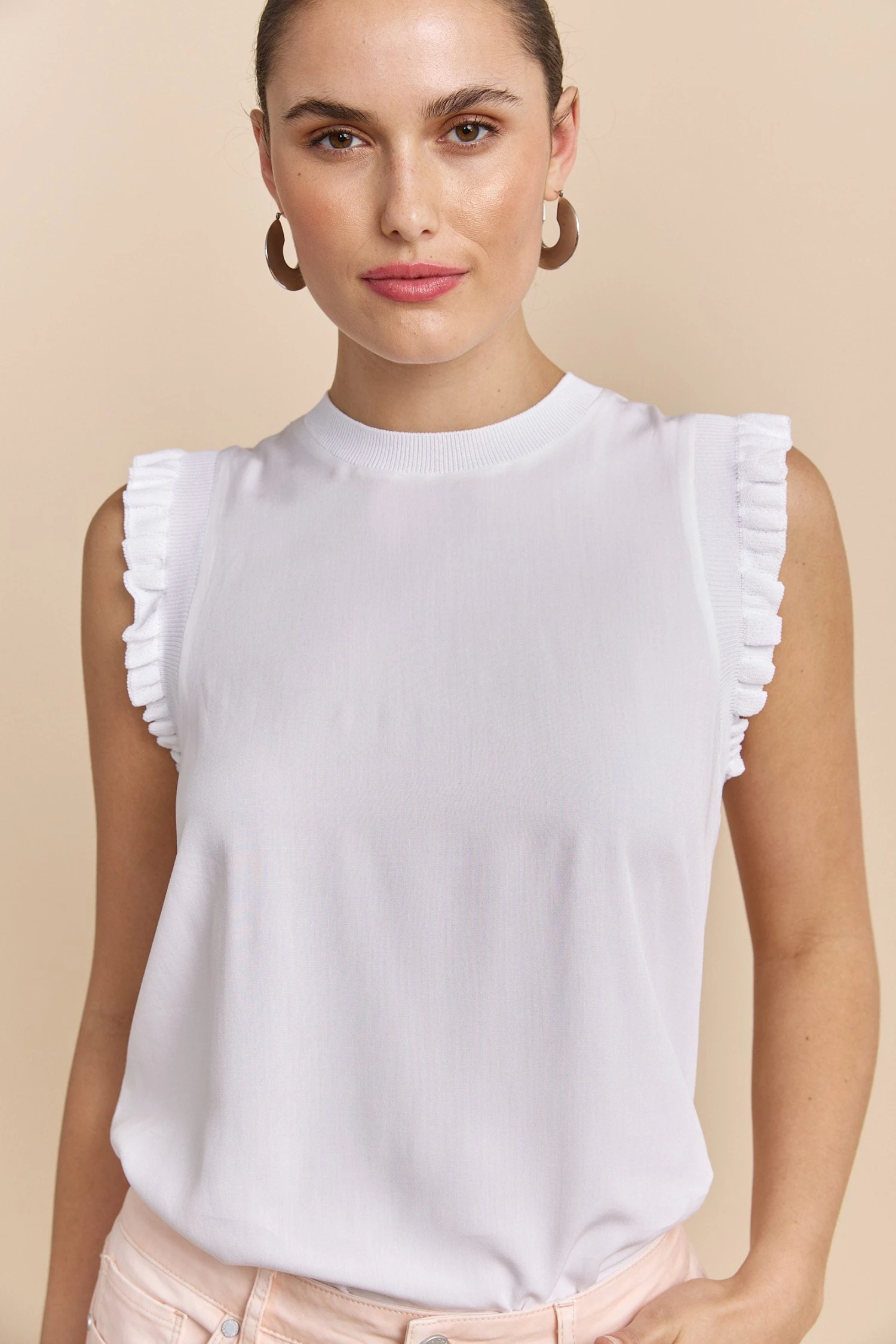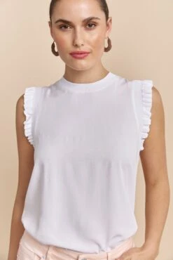 A crisp white top that perfectly balances playful frills with a sleek rib design to add charm to your style! Crafted for comfort and flair, this versatile piece is ideal for any wardrobe, pairing seamlessly with both jeans and skirts for a refined look.