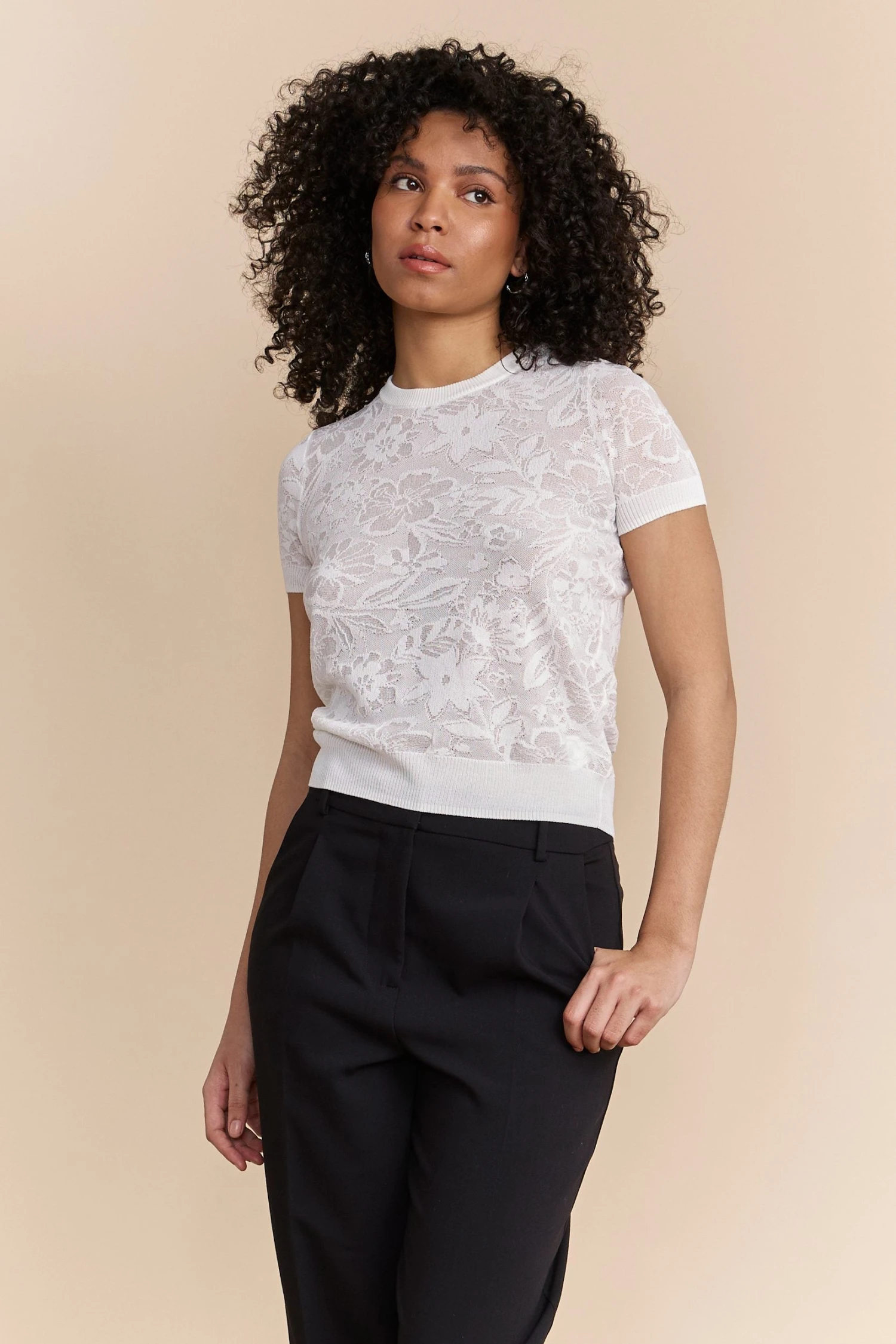 For those who adore unique style with a touch of elegance, this short sleeve sweater with its intricate mesh and floral design is a must-have! Crafted from breathable fabric, it offers comfort and contemporary fashion for any occasion. Pair it with tailored trousers for a truly sophisticated ensemble.